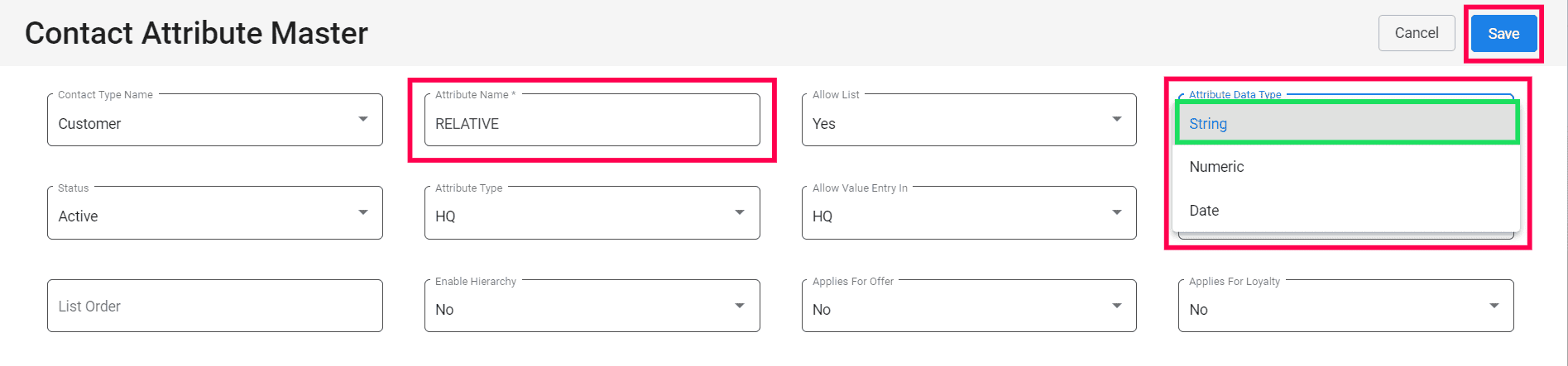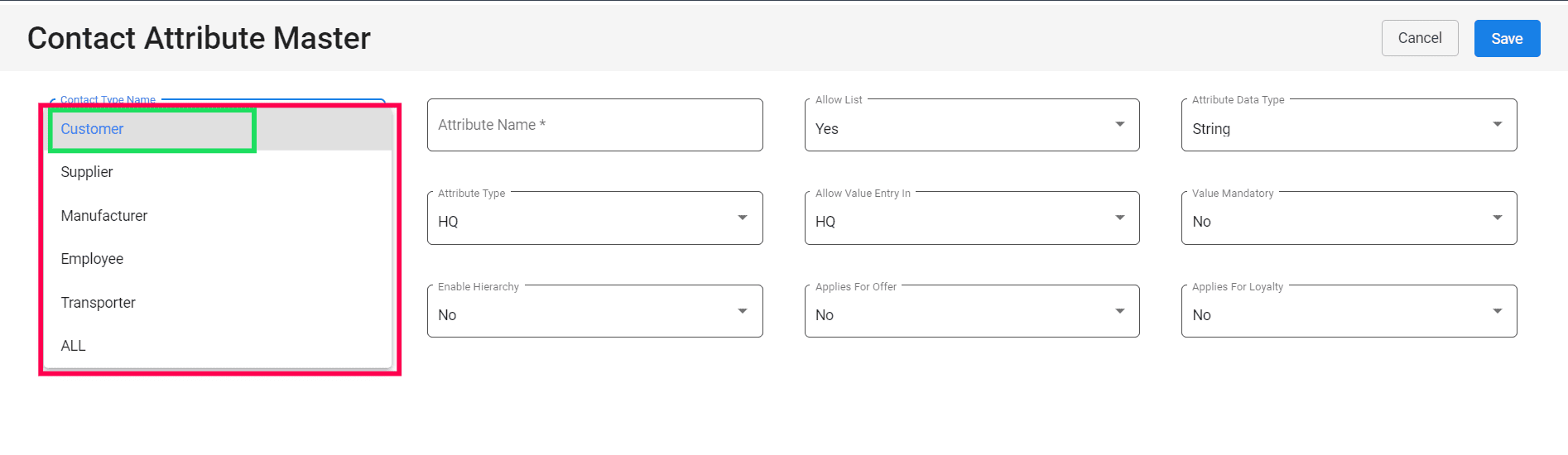 1. Go to MDM > Attribute Master Management > Contact Attribute Master.