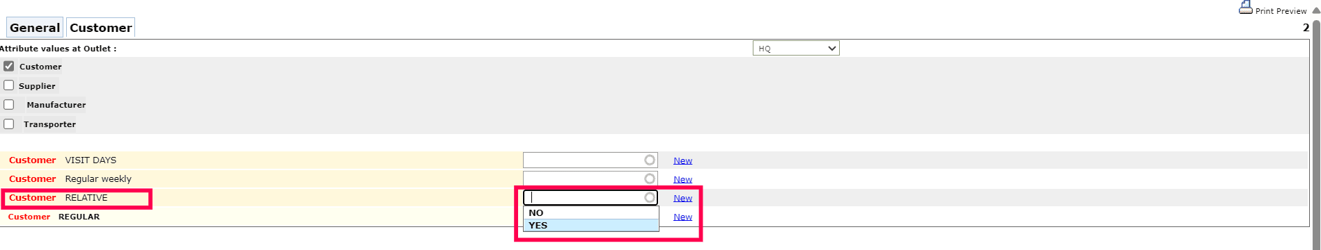 7. When you're setting up the Customer Master, look for the "RELATIVE" attribute. You can choose either "YES" or "NO" from the options provided based on your preference.