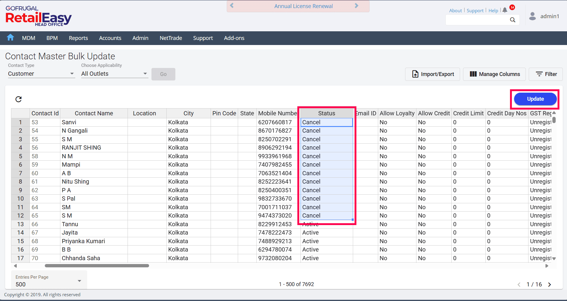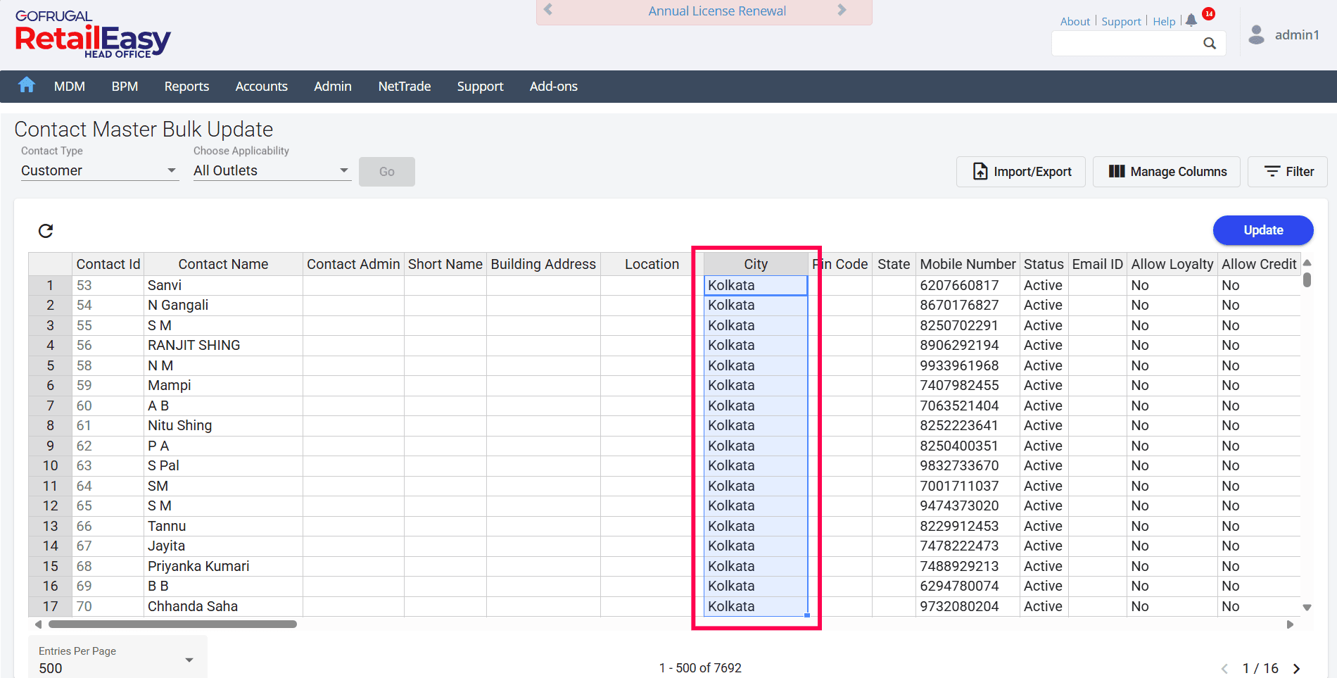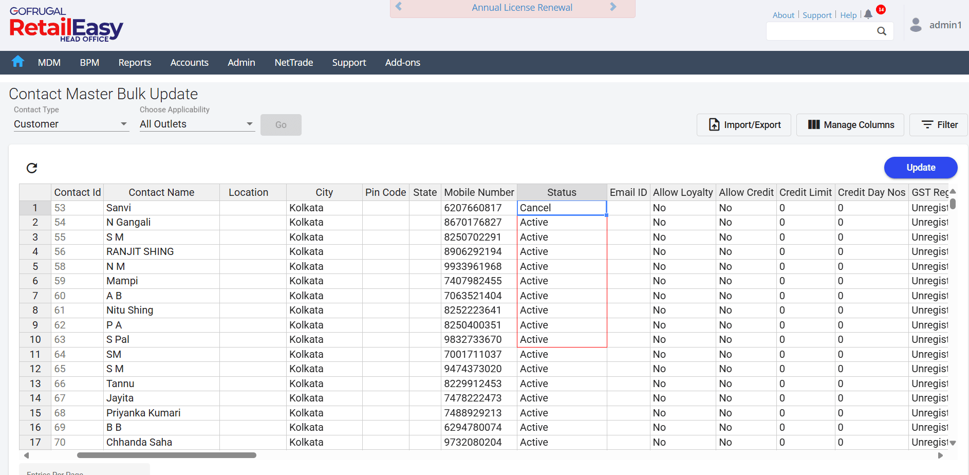 Contact Master Bulk Update in GOFRUGAL HQ This document explains how to perform a bulk update on contact information within the Contact Master module of GOFRUGAL HQ. This functionality is beneficial when you need to modify the same details for a ...