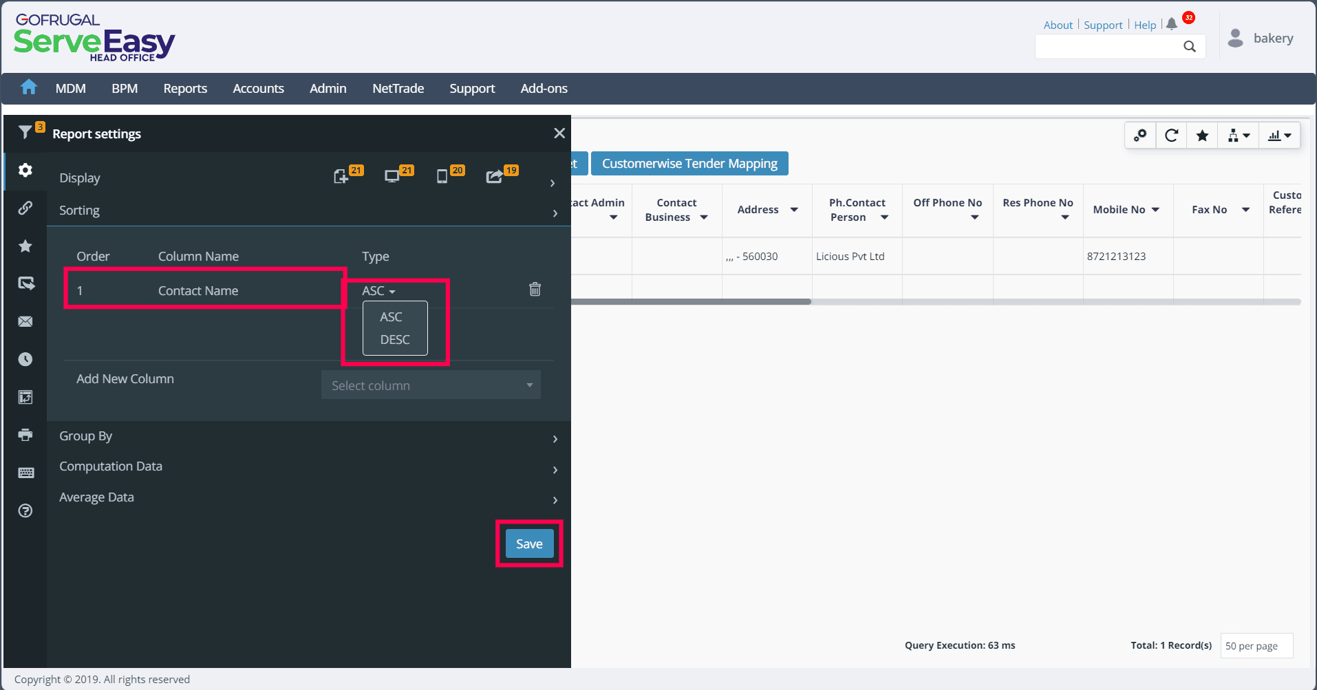 In the same Settings menu, you'll also see the Sorting feature. Just click on the dropdown menu for Add New Column. There, you'll find options like Edit, Contact ID, Contact Name, Short Name, Contact Admin, and more. Choose the option you prefer to sort the contact masters. To demonstrate, we have used Contact Name as our example.