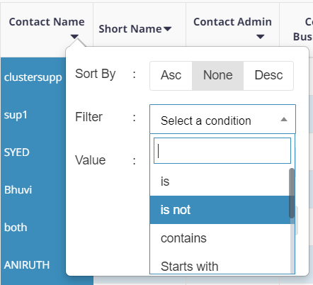 1. Click on the drop-down menu option and you can sort the results and use advanced filter conditions like "is," "is not," "contains," "Starts with," etc.