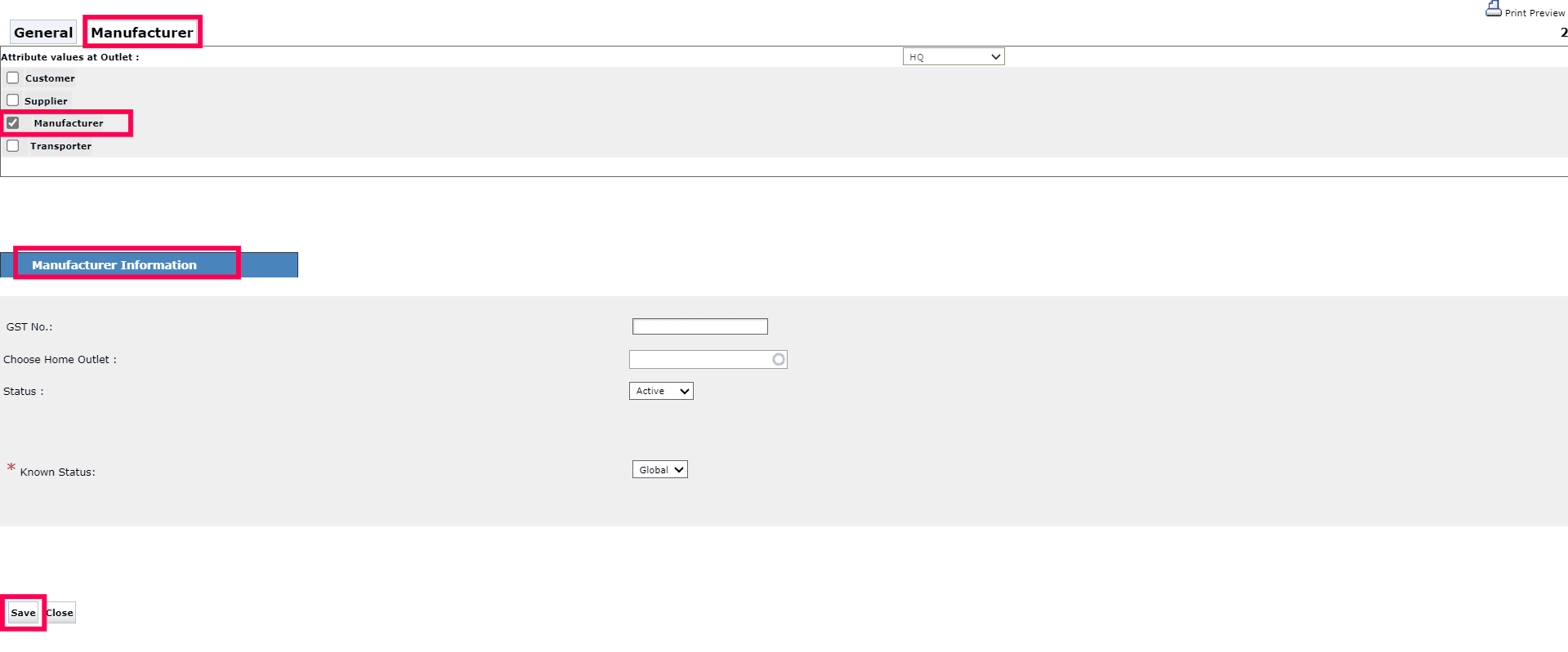 Note: If you pick Manufacturer as the Contact Type, you'll see a new tab called Manufacturer appear alongside the General tab. Click on it. Then fill in all the relevant information under the Manufacturer Information tab. Once all the data is entered, scroll down and click Save to save the supplier master.