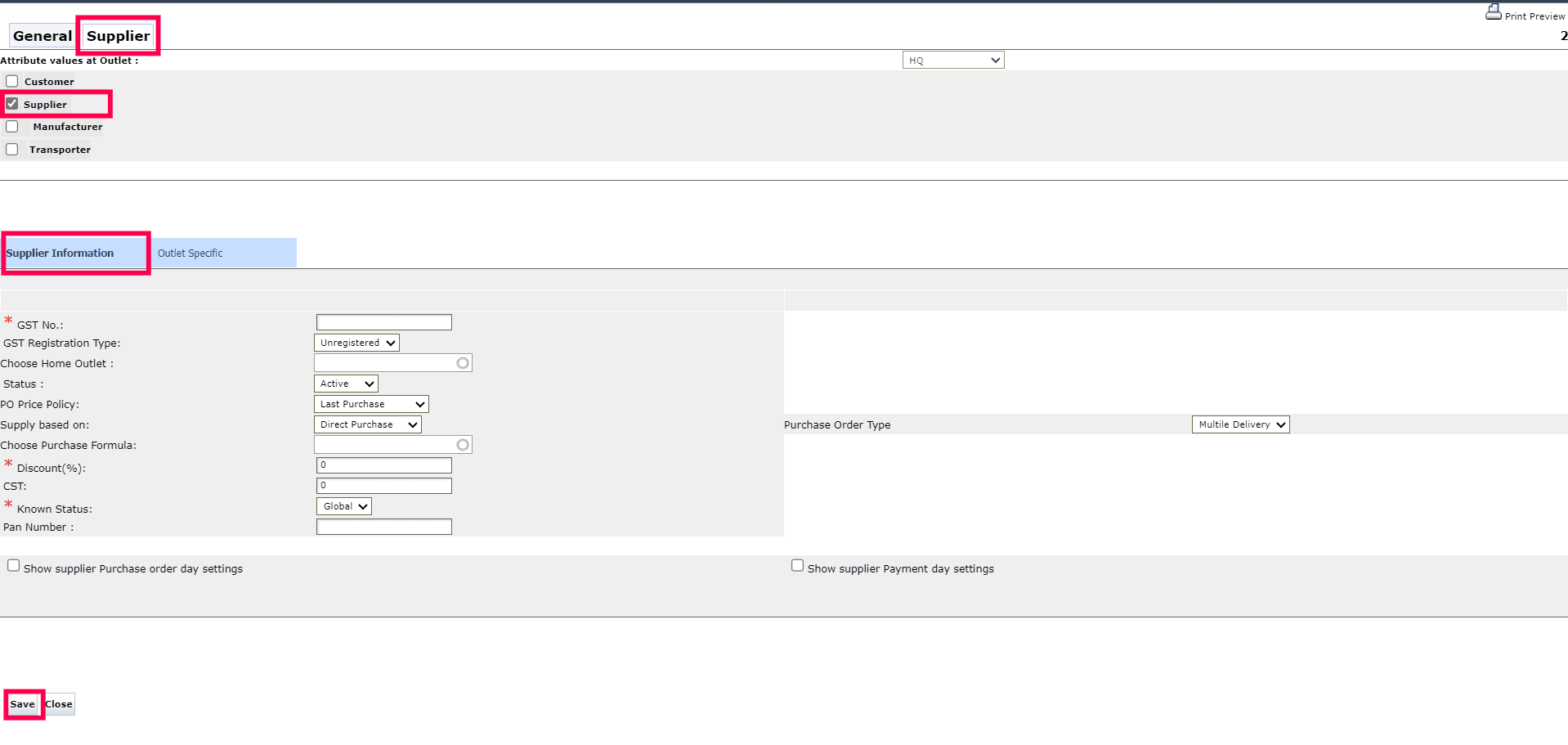Note: If you pick Supplier as the Contact Type, you'll see a new tab called Supplier appear alongside the General tab. Click on it. Then fill in all the relevant information under the Supplier Information tab. Once all the data is entered, scroll down and click Save to save the supplier master.