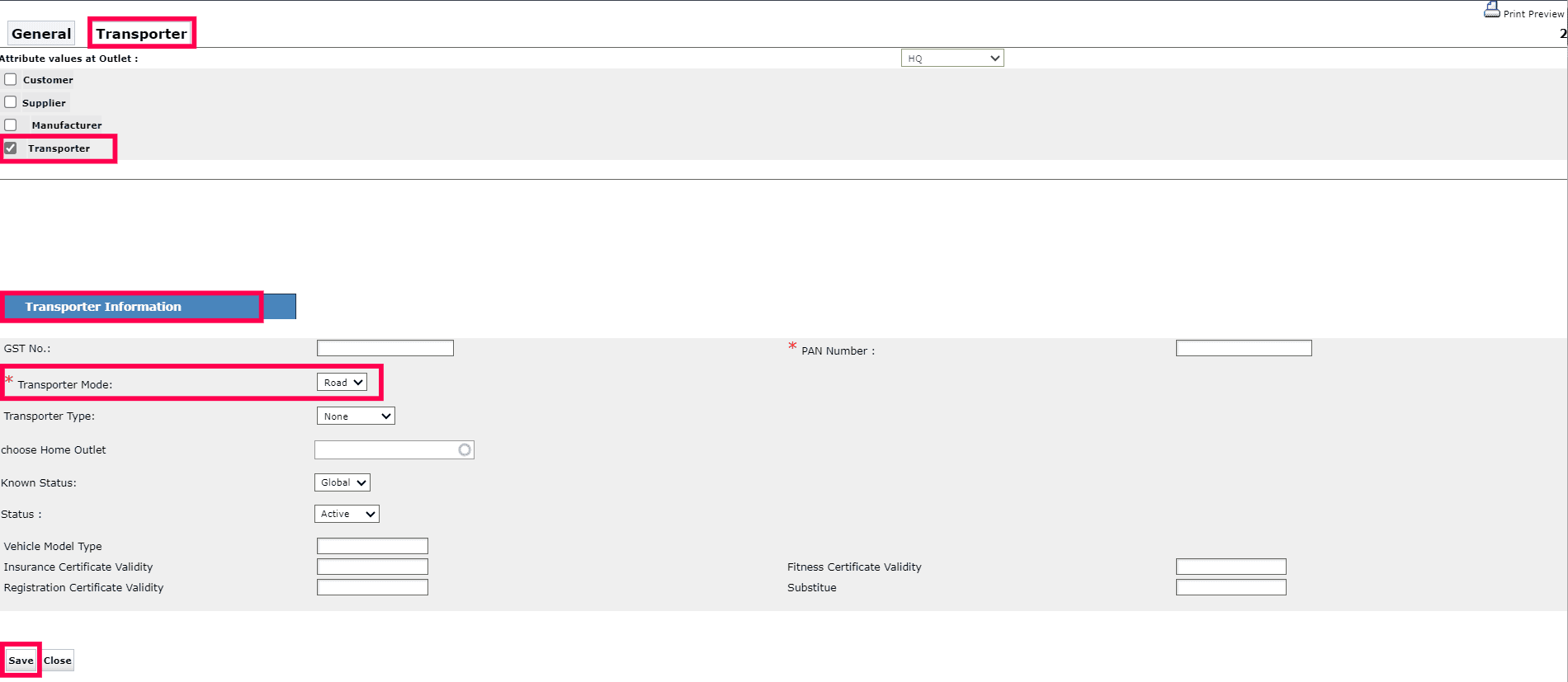 Note: If you pick Transporter as the Contact Type, you'll see a new tab called Transporter appear alongside the General tab. Click on it. Then fill in all the relevant information under the Transporter Information tab. Once all the data is entered, scroll down and click Save to save the supplier master.