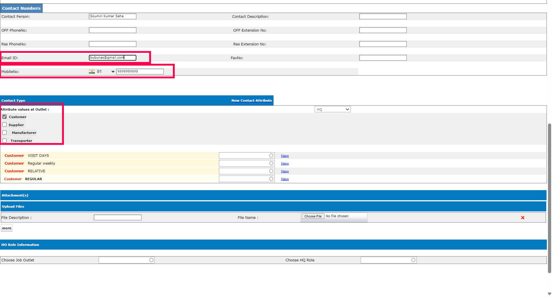 4. Fill in the Email ID and the Mobile No. fields. The Mobile No. is mandatory for all contact types.