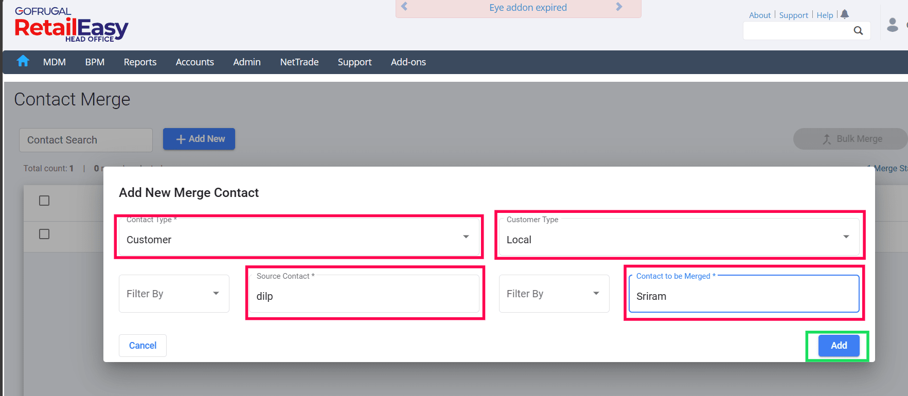 3. On the Add New Merge Contact pop-up, select the desired Contact Type (Customer/Supplier/Manufacturer) and the Customer Type from their respective drop-downs. Enter the Source Contact and the Contact to be Merged in the respective fields. Then, click Add.