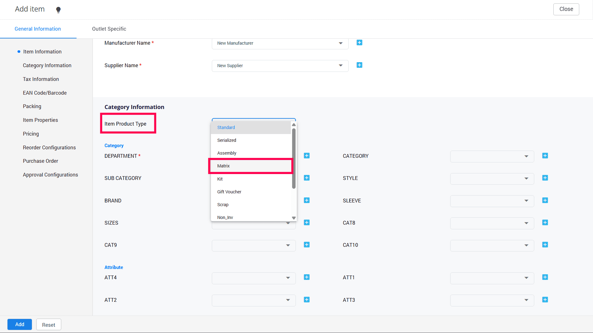 Select the Item Product Type as Matrix.