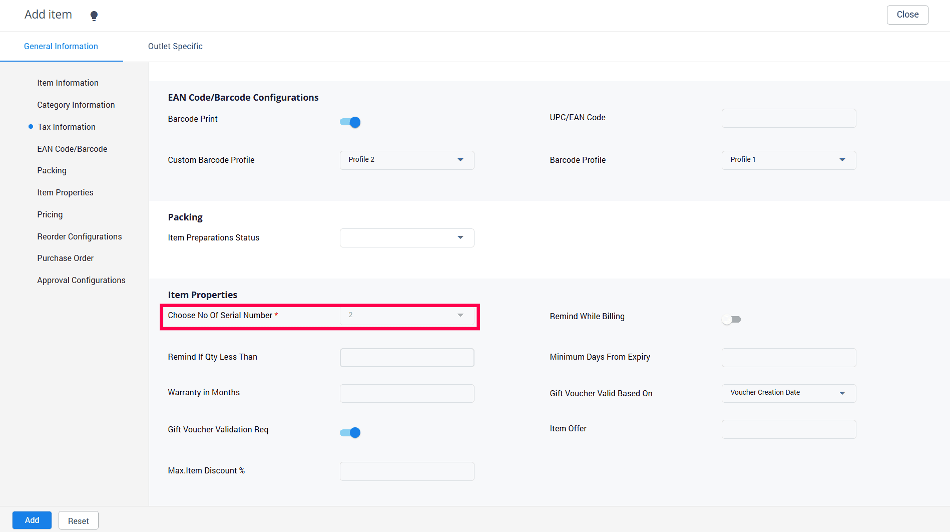 The Choose No Of Serial Number box will be auto populated in the Item Properties section by default.