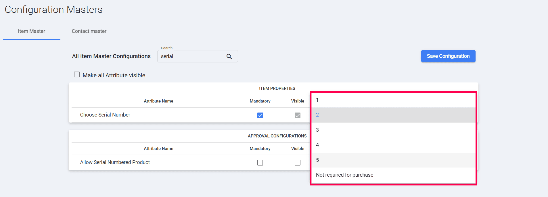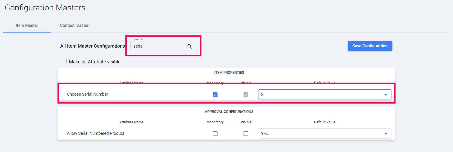 Search for the keyword "serial" in the All-Item Master Configurations search bar.