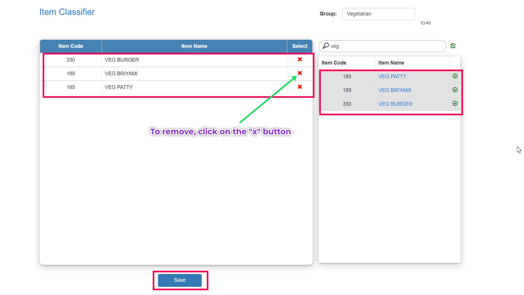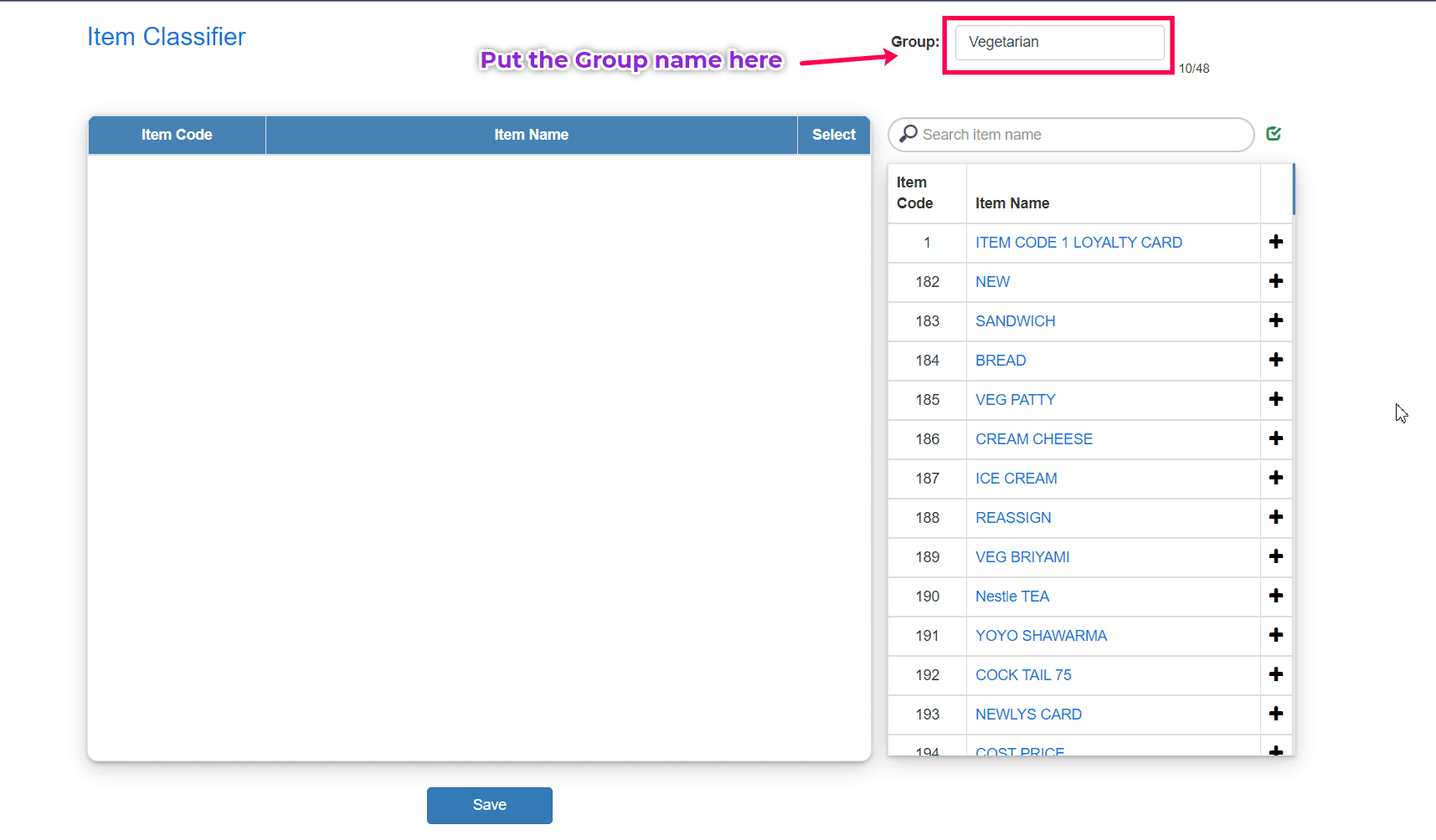 To add items to the classifier, type the Item Name in the search box and click the+ (Plus) icon to add the item to the selected Item Classifier group.
