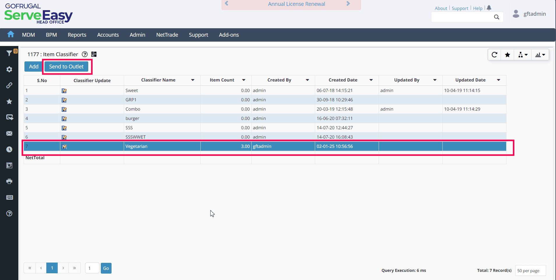 Verify the newly created Item Classifier in the list, then click the Send to Outlet button to distribute the master to all configured outlets.