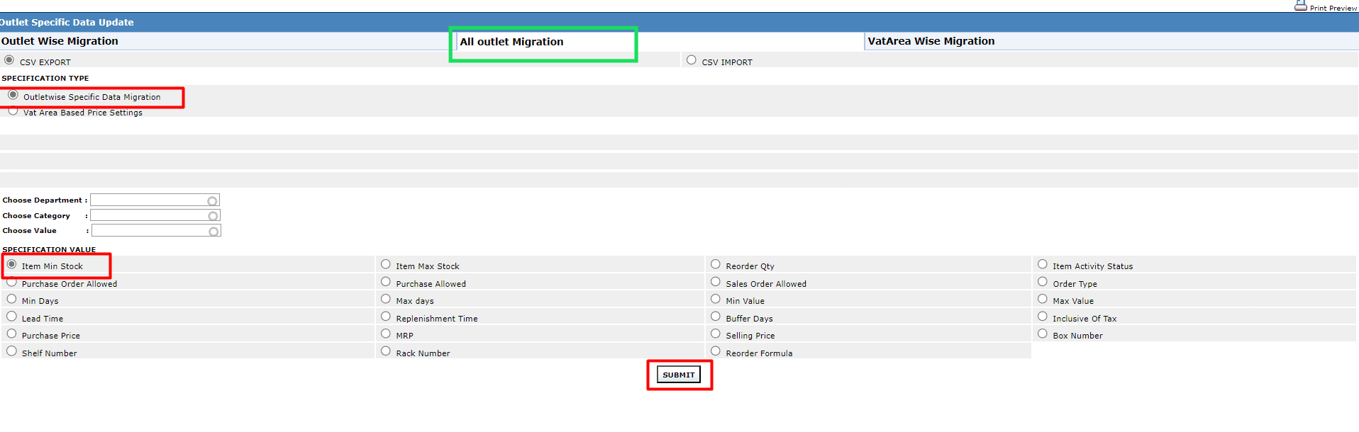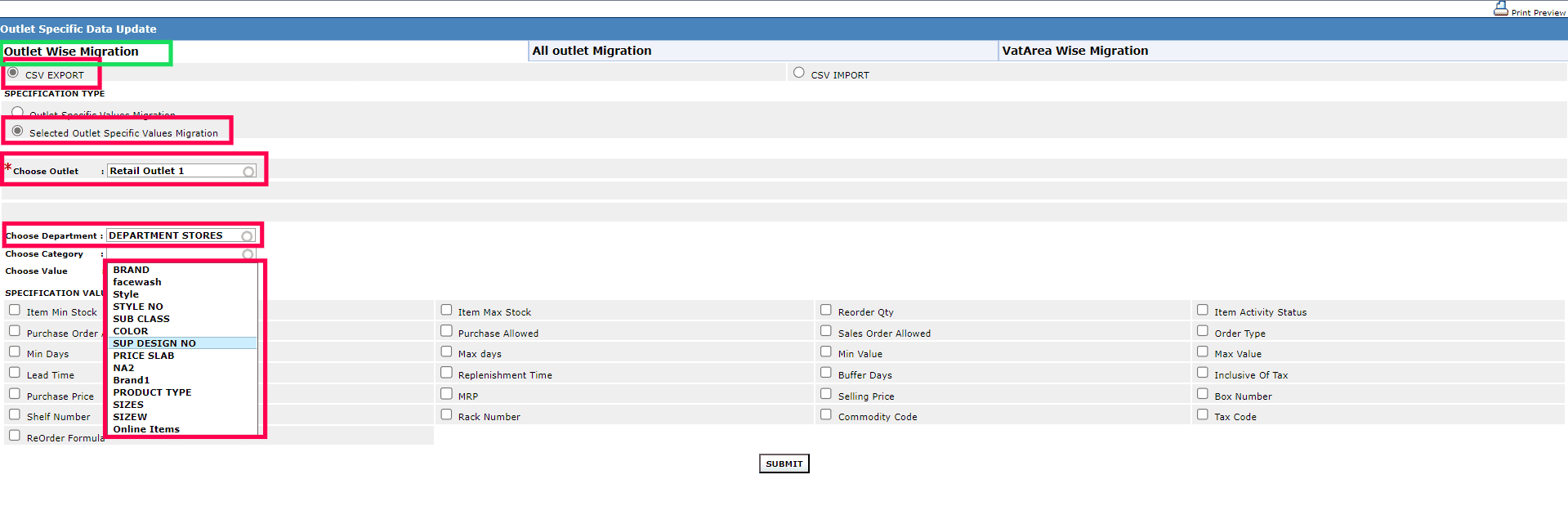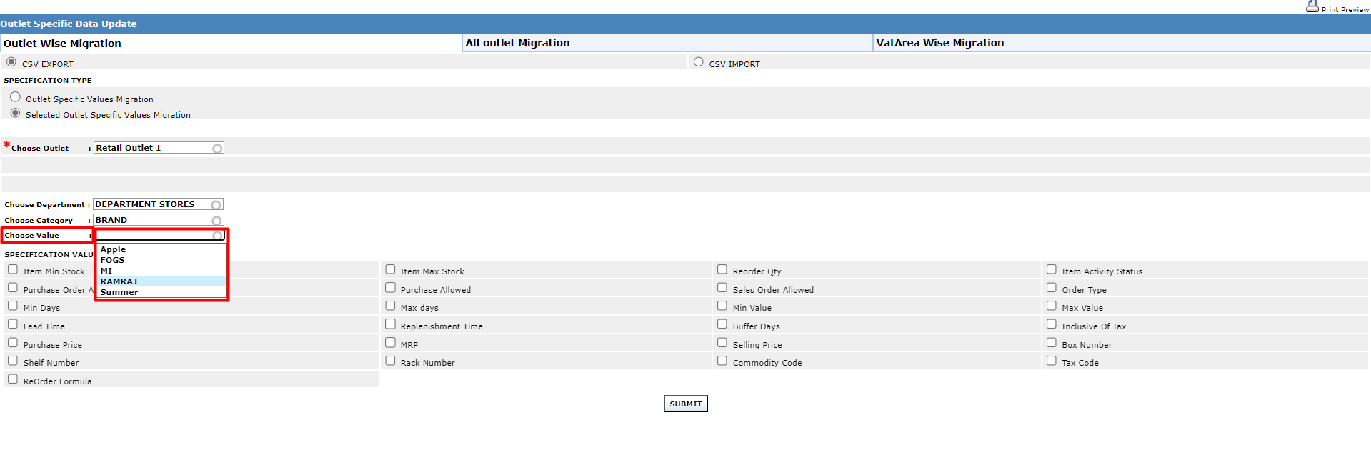 2. Click Outlet Wise Migration and then click Selected Outlet Specific Values Migration.