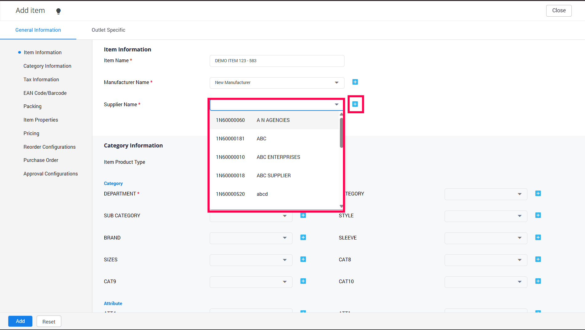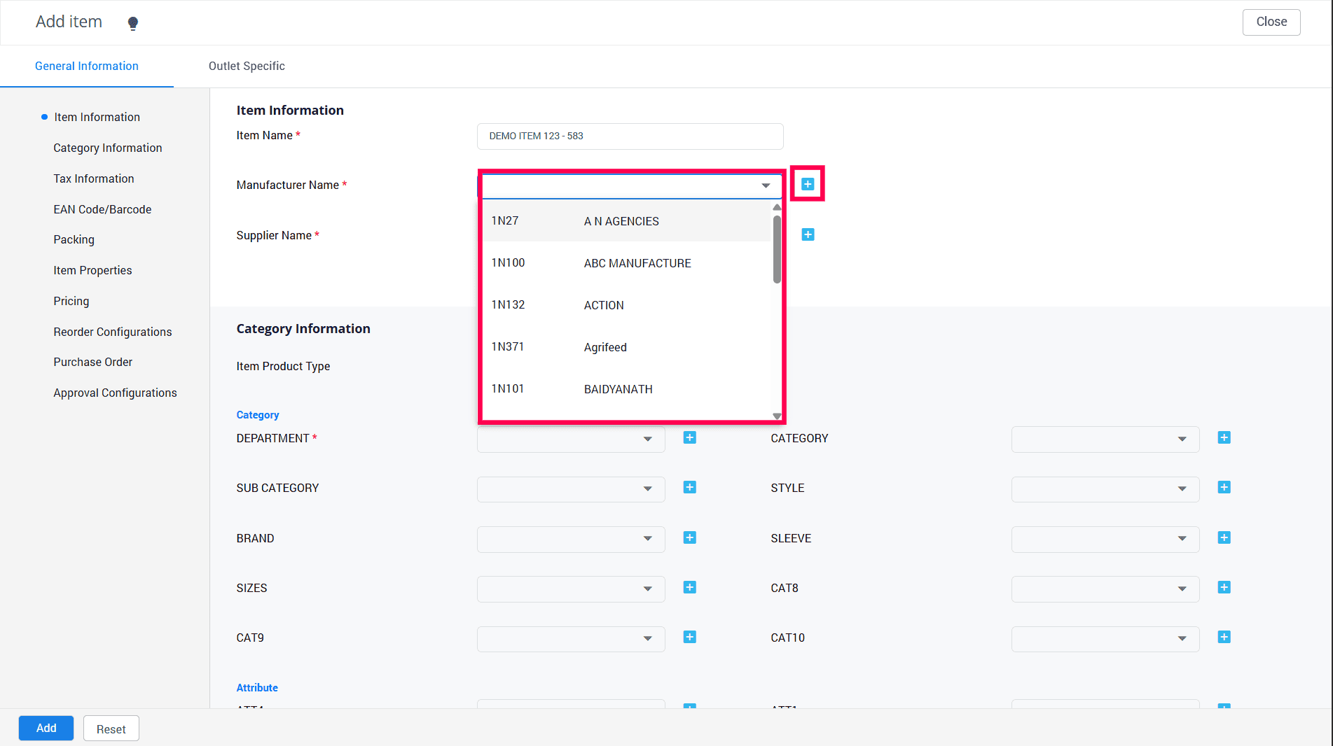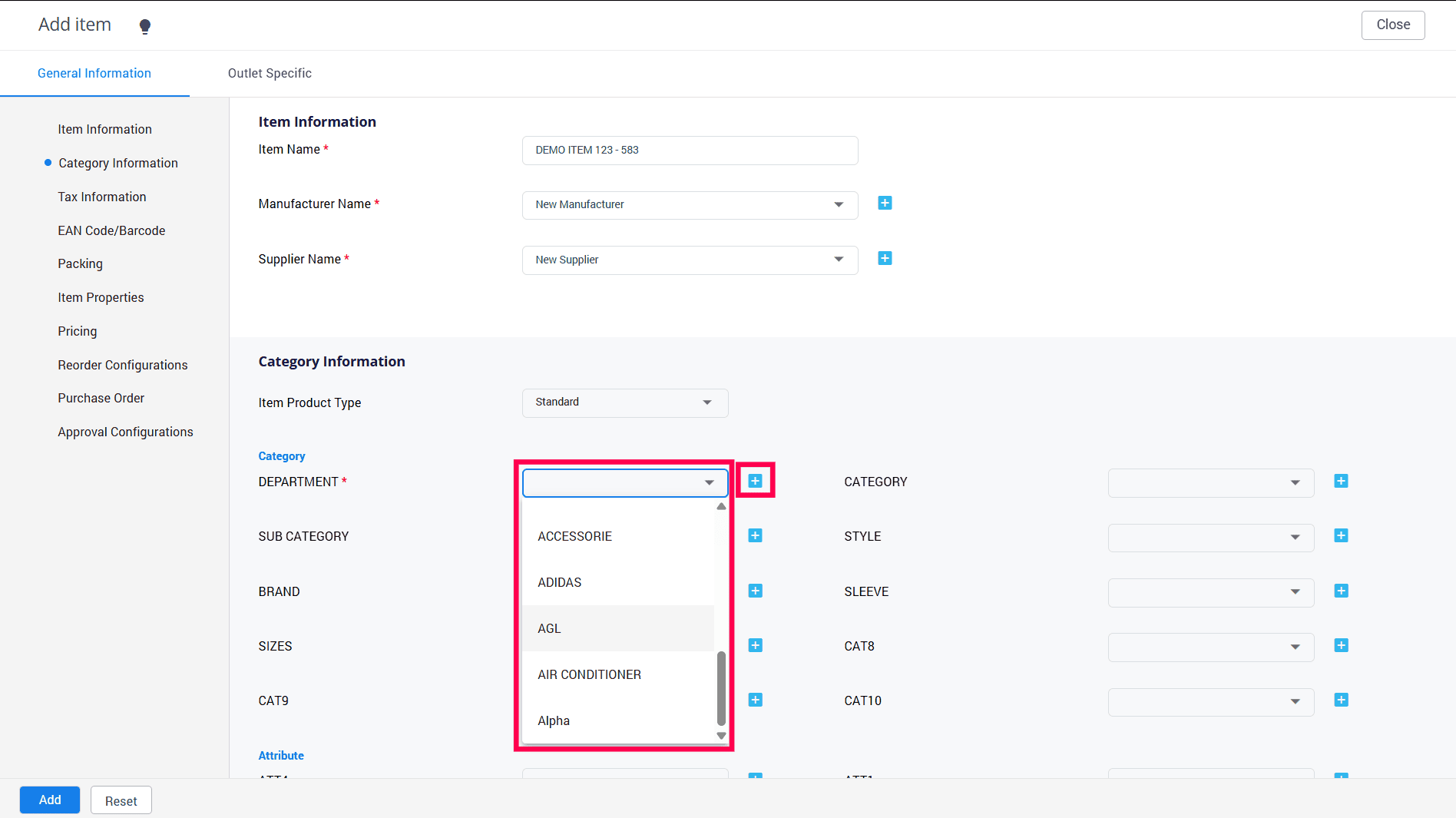 7. Choose your preferred category from the available options. Please remember that categories marked with (*) are required fields. If you don't see the category name you're looking for, simply click the "+" sign to access the Item Attribute List Master.