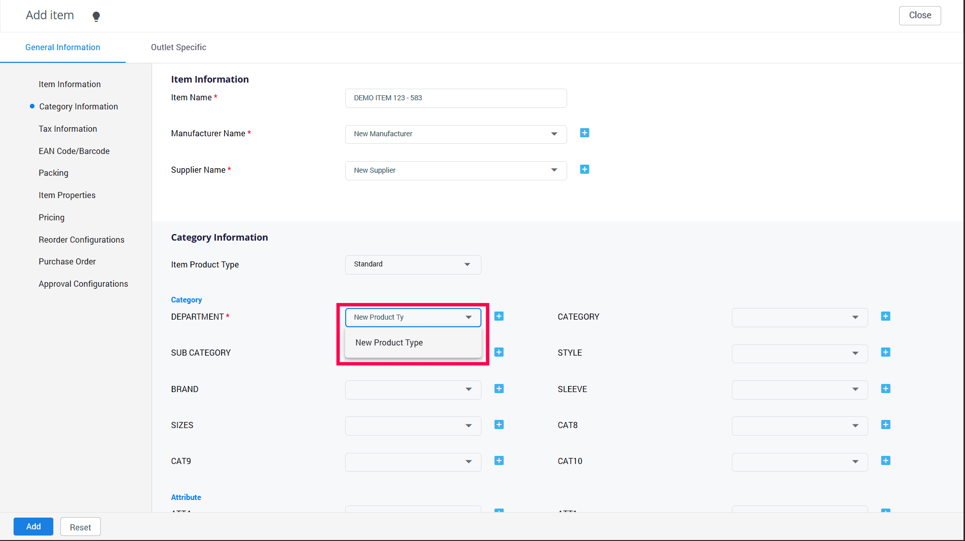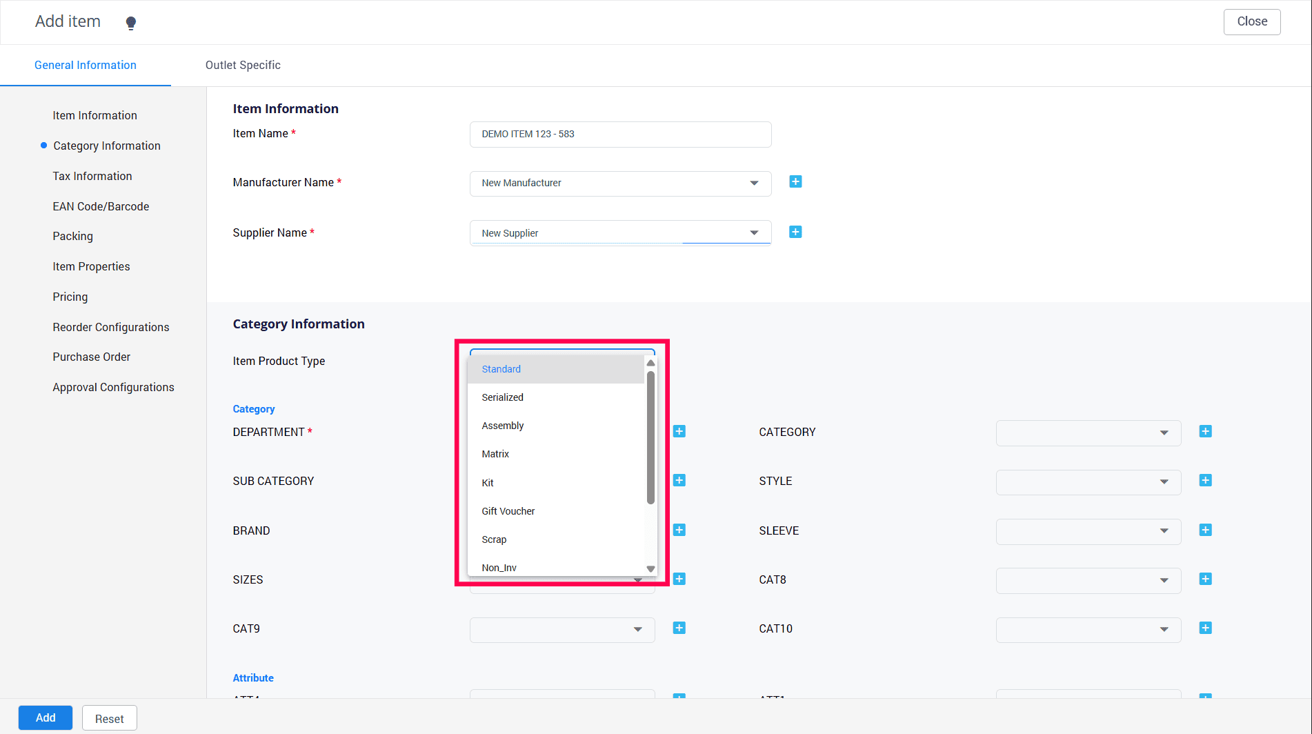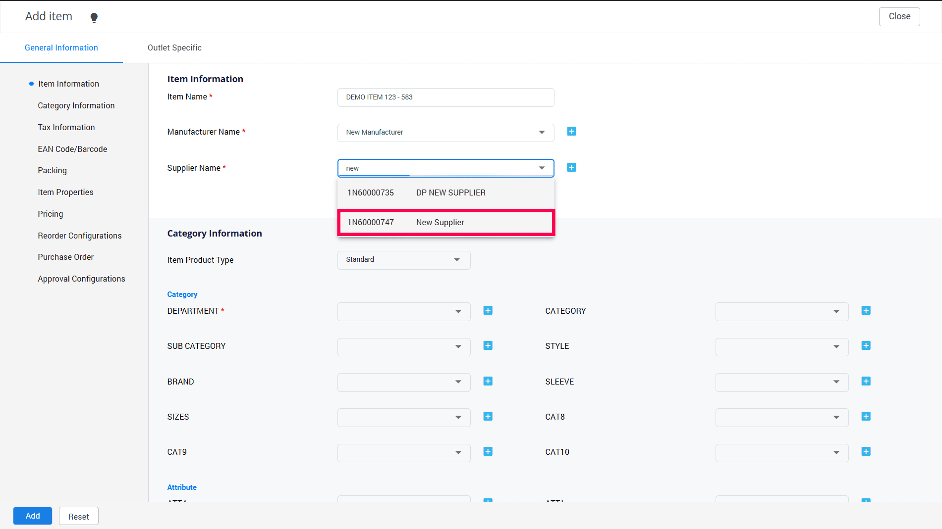 7. Choose your preferred category from the available options. Please remember that categories marked with (*) are required fields. If you don't see the category name you're looking for, simply click the "+" sign to access the Item Attribute List Master.