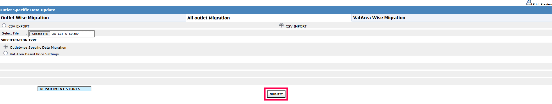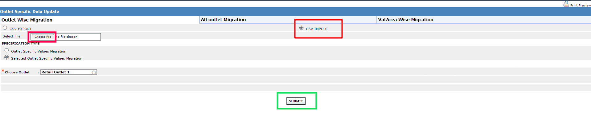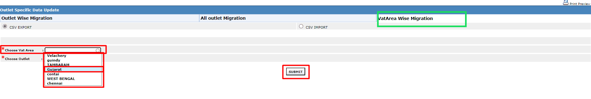 Note: You can click the VatArea Wise Migration tab, choose the VAT Area & Outlet as needed and click SUBMIT.