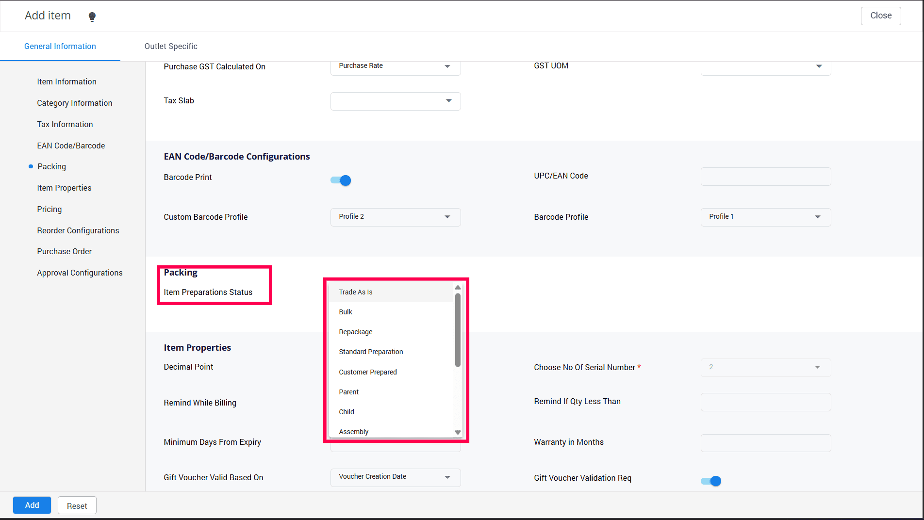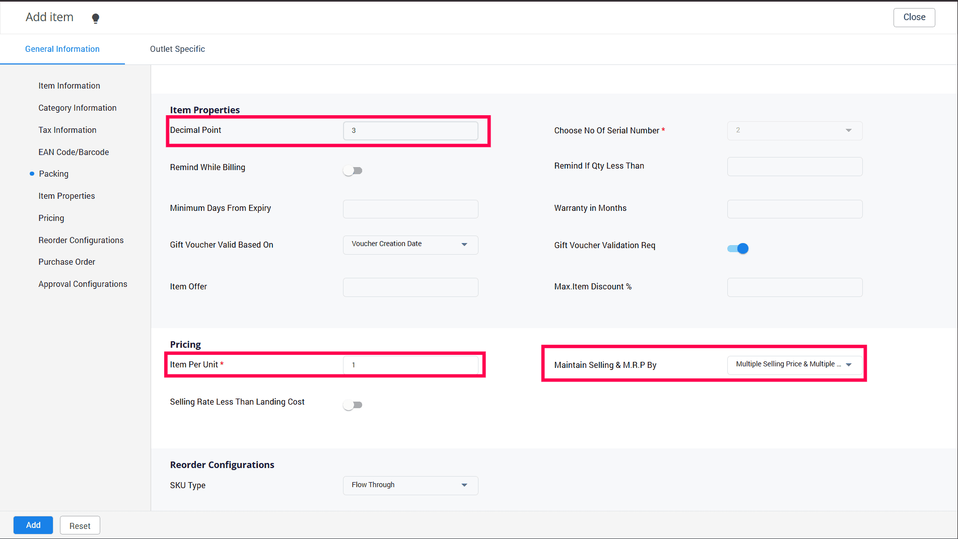 Fill out the important fields like Decimal Point, UPC/EAN Code, Is weighable, Item Per Unit, Batch/Expiry Date Details, Batch/Expiry Optional, Maintain Selling MRP By, Item Preparation Status, etc.