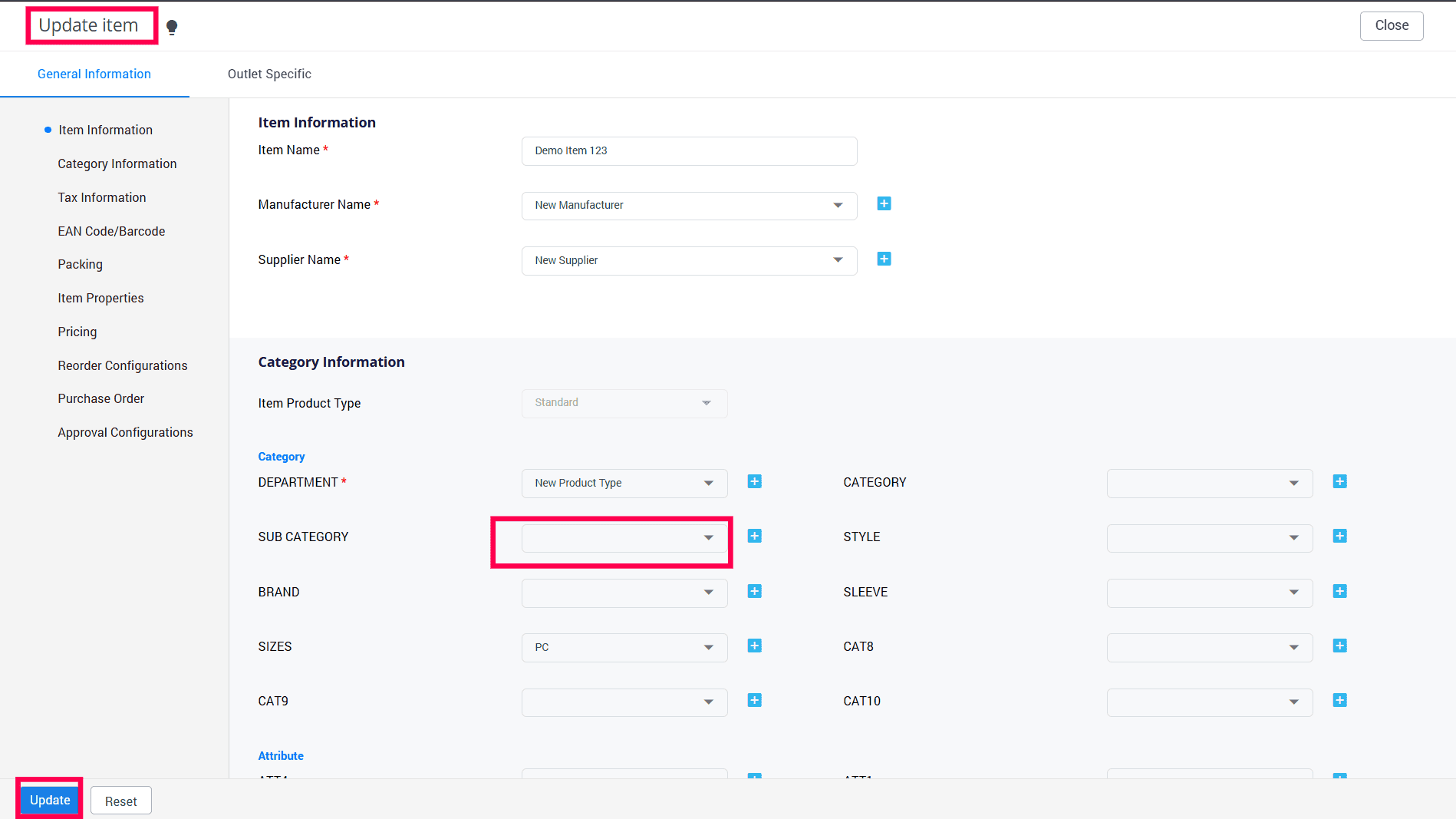 Outlet Specific Data: Clicking this button allows you to update multiple types of item specification values, like item min stock, item max stock, reorder qty, etc. in bulk.