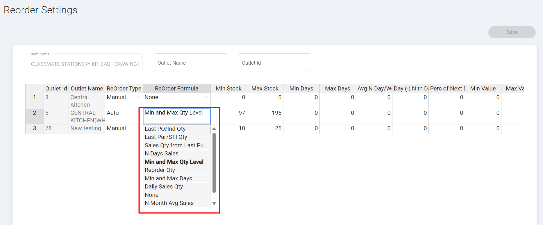 3. Select one of the following options from the ReOrder Formula column: Min and Max Qty Level, Min and Max Days, Daily Sales Qty, or None based on your need.