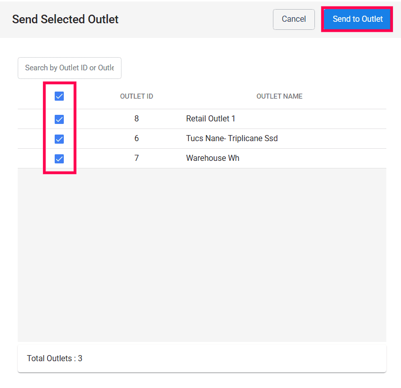 Send Selected Outlet: By clicking on this button, you can send the selected items to the selected outlets.