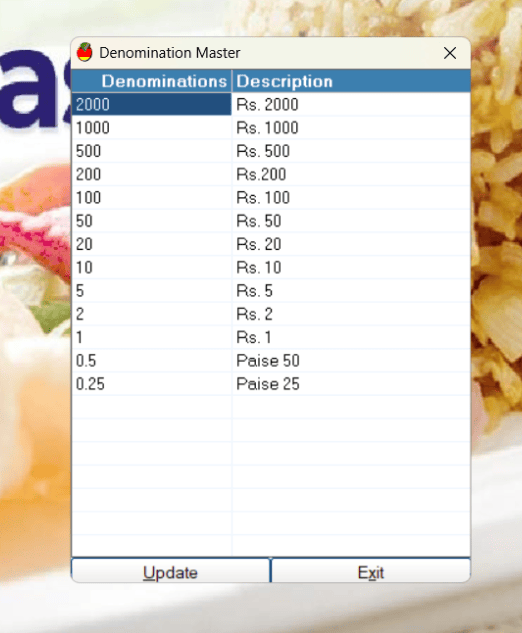 Manage Denomination Changes. You can update the list of denominations as needed, such as when new currency notes are introduced or old ones are withdrawn.