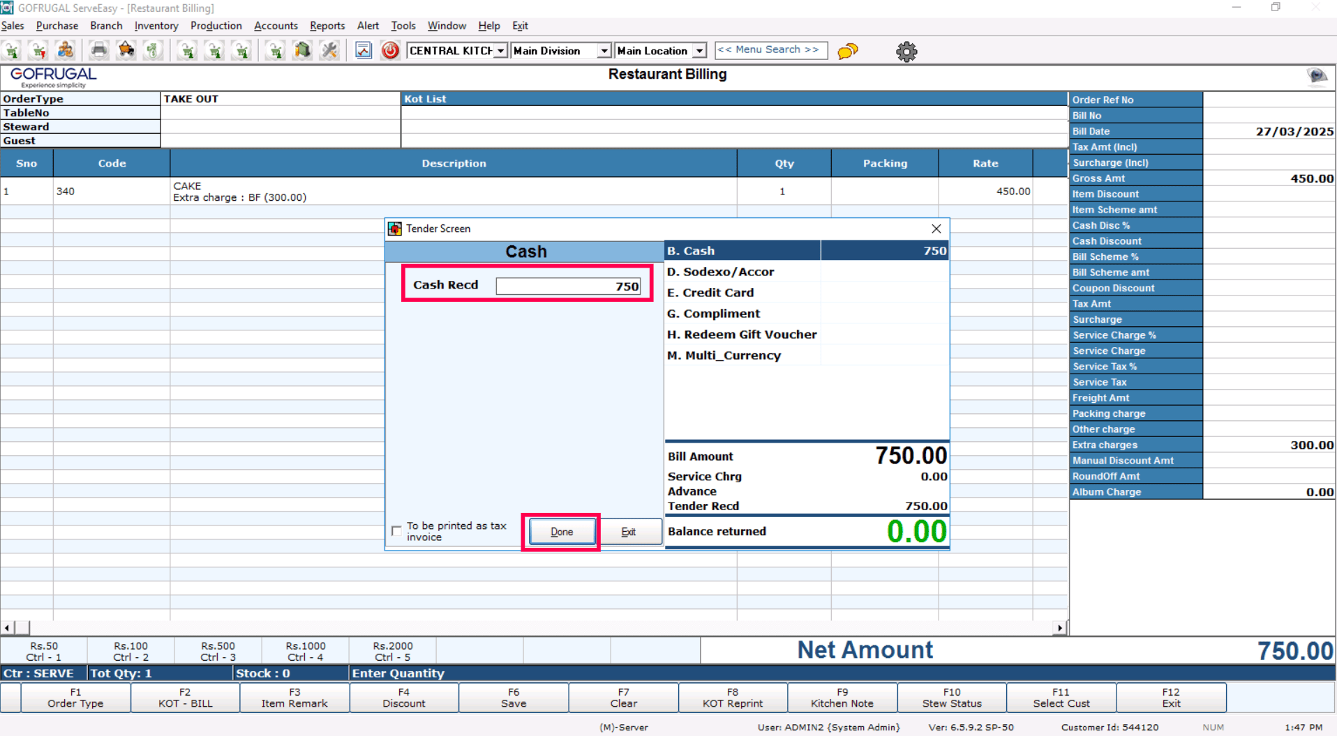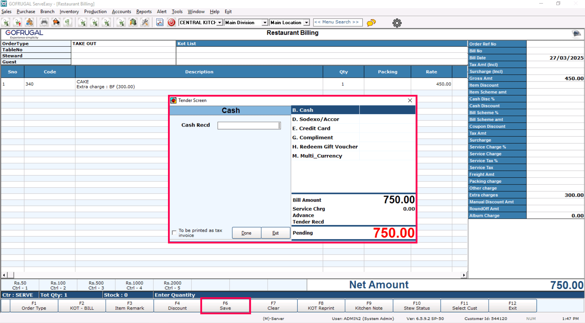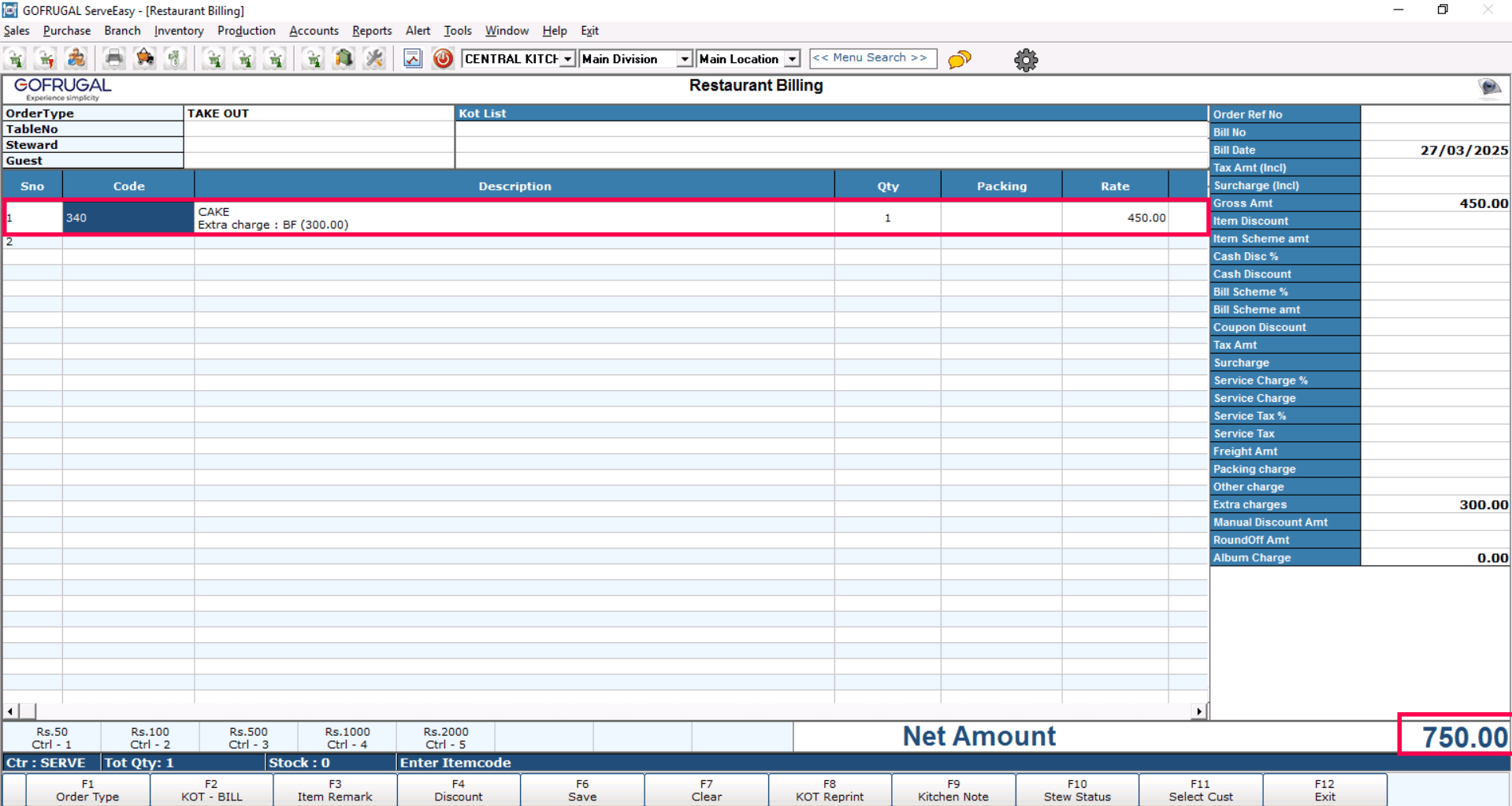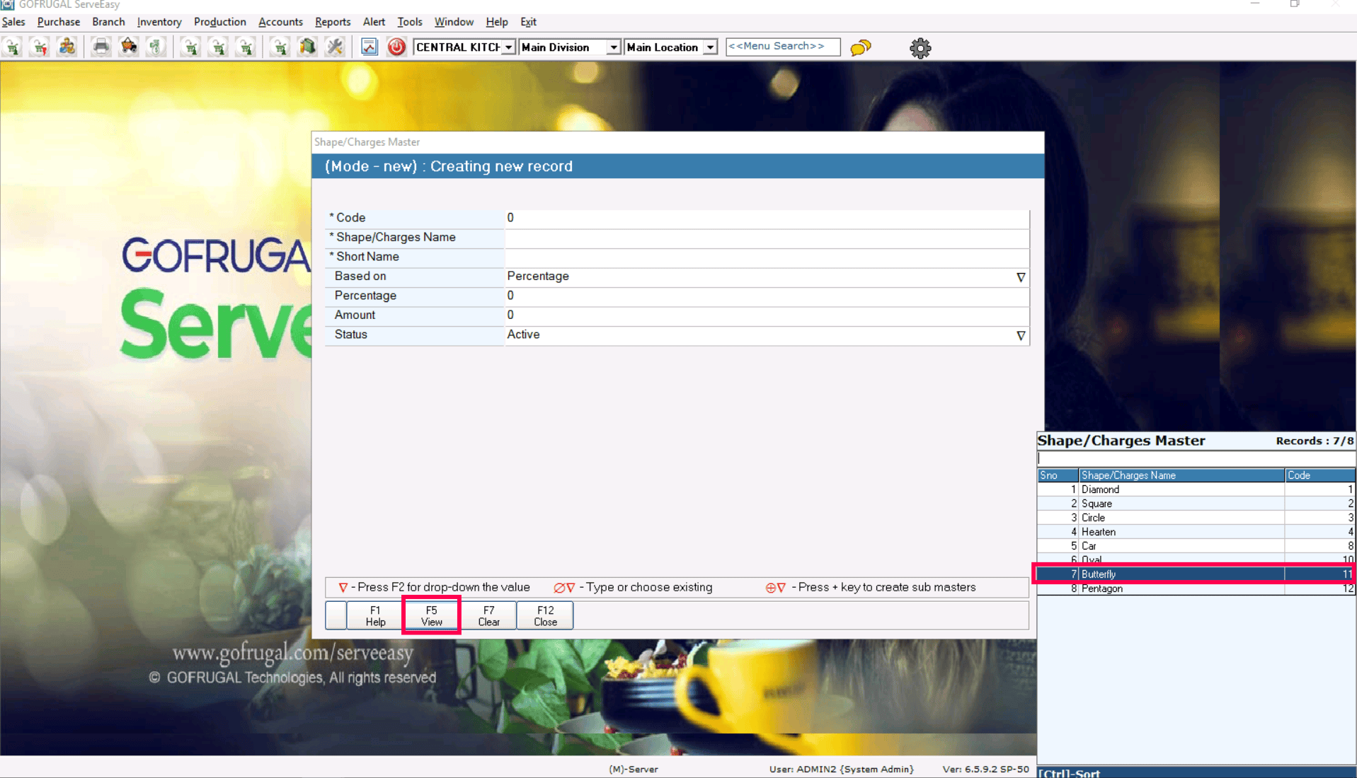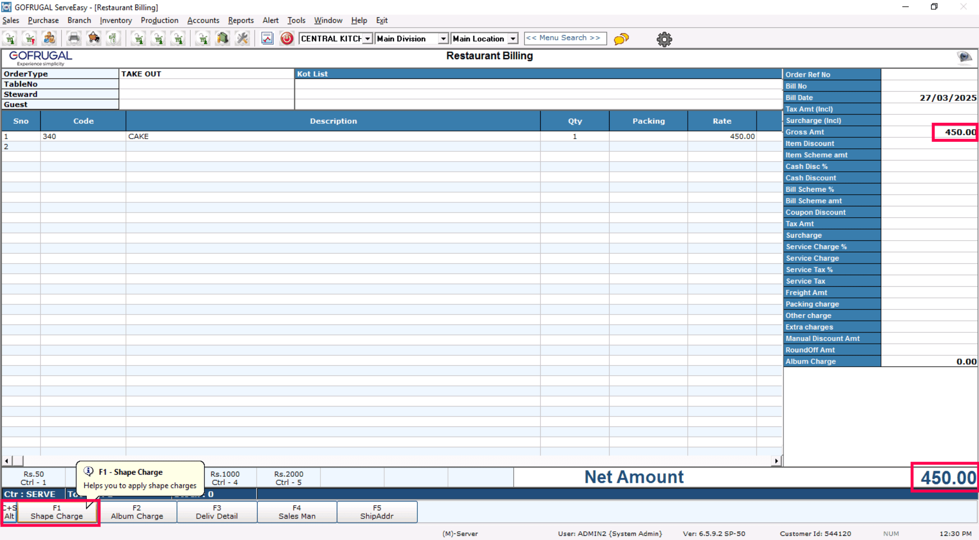 Go to the Restaurant Billing screen and press the F1 – Shape Charge key to load and apply the available shape charges during billing.