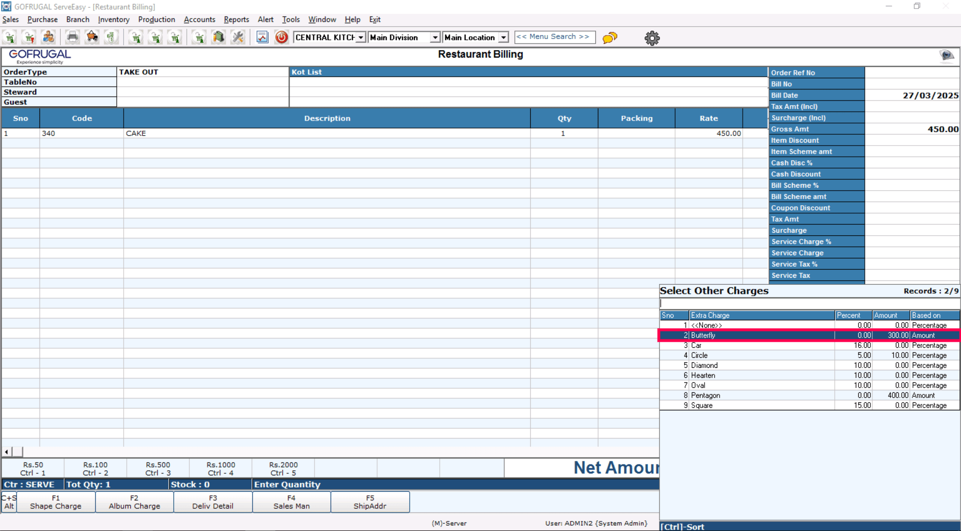 Select the required shape charge (for example, Butterfly) from the list to apply it to the bill.