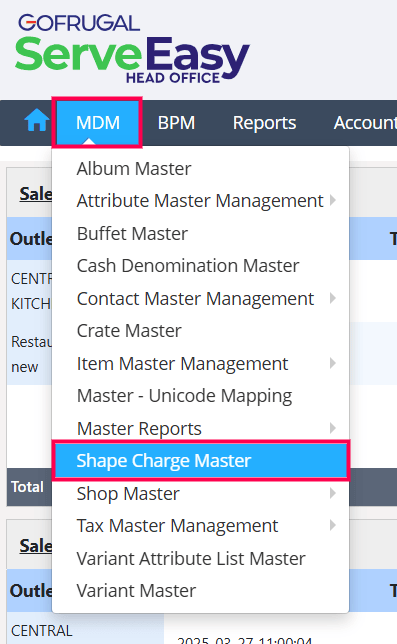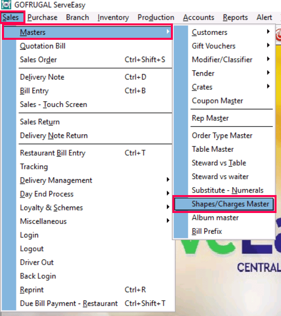 Open the outlet POS and navigate to Sales > Masters > Shapes/Charges Master.