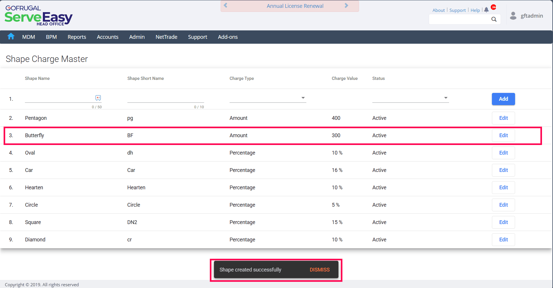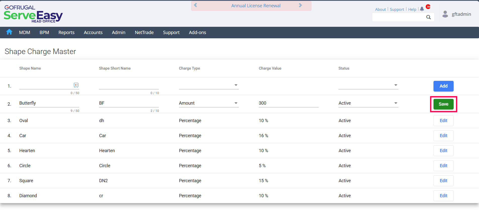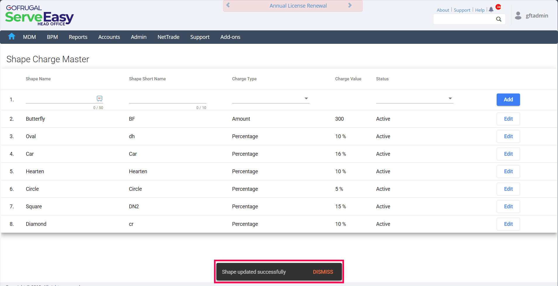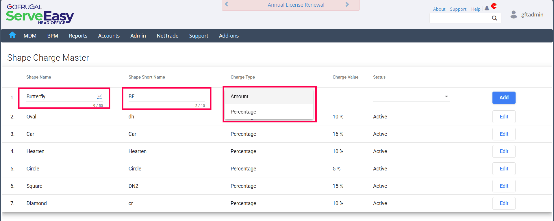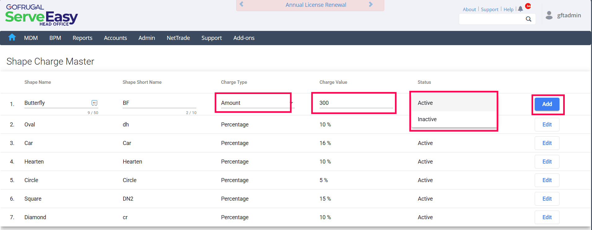 Enter the Charge Value, set the Status as Active or Inactive as required, then click the Add button to save the shape charge configuration.