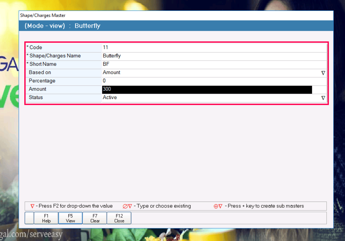 Press the F5 (View) button and check the LOV (List of Values) to verify whether the newly created Shape and its corresponding charges are reflected in the POS.
