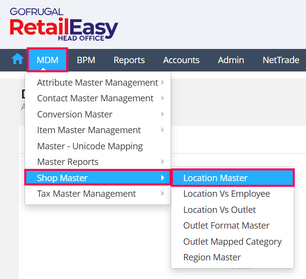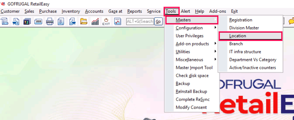 Open the outlet POS application and navigate to Tools > Masters > Location.