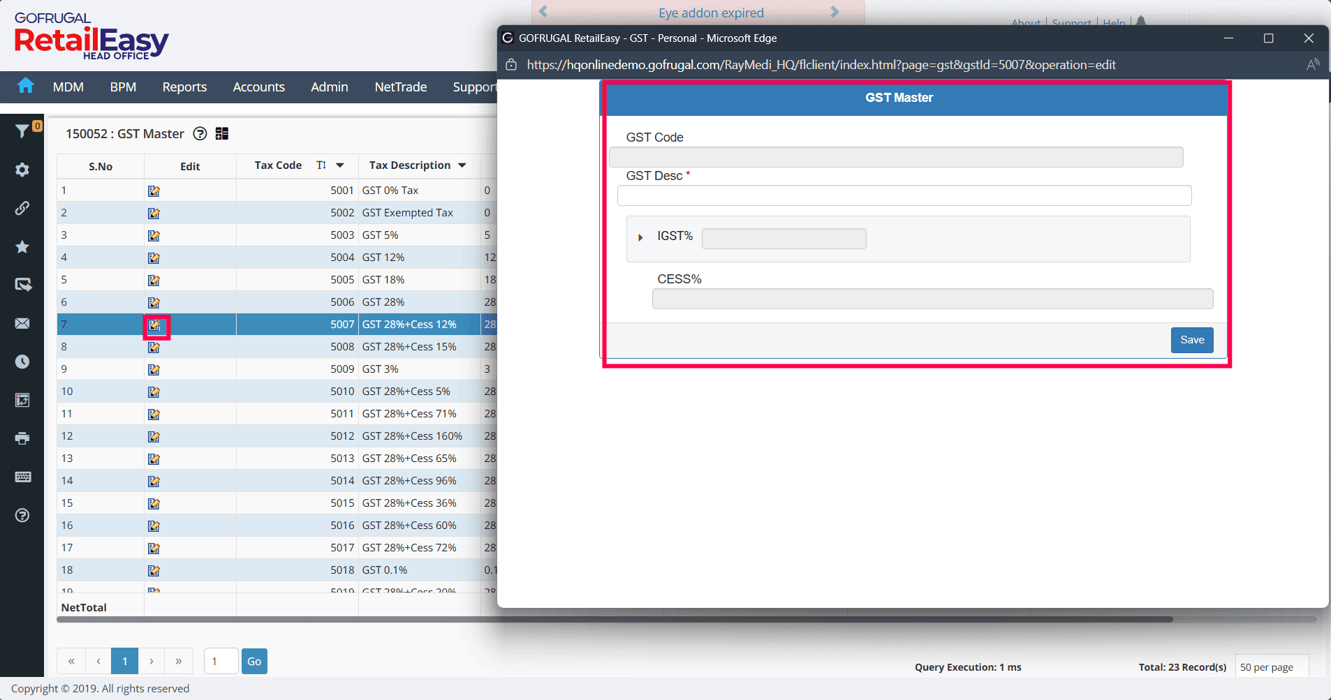 Note: Editing or modifying the GST Master is not allowed. If you attempt to do so, you will encounter blank options, similar to the screenshot below.