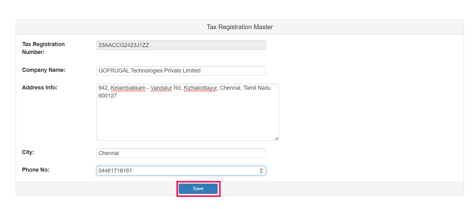Click the Save button. A message will appear stating, "Tax Registration Number is saved successfully."
