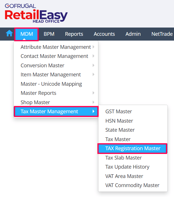 Navigate to MDM > Tax Master Management > Tax Registration Master.