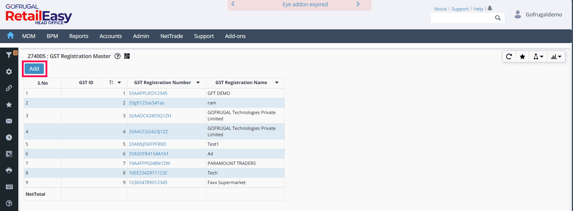 Tax Master is a tool designed to create a tax master with various tax components tailored to the business's needs and requirements. Let's take a look at how it's done. Navigate to MDM > Tax Master Management > Tax Master. Click the Add button. In the ...