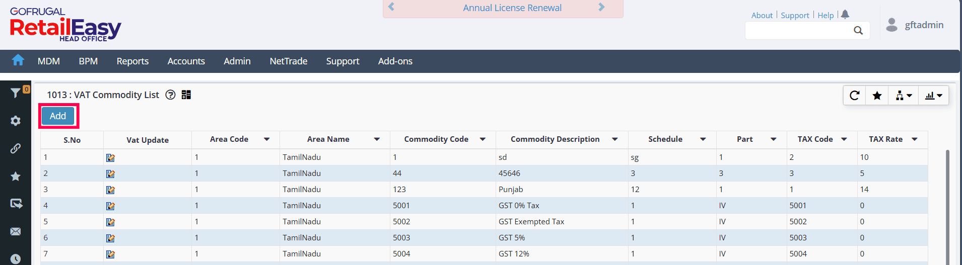 Navigate to MDM > Tax Master Management > VAT Commodity Master. This will display the VAT Commodity List screen.