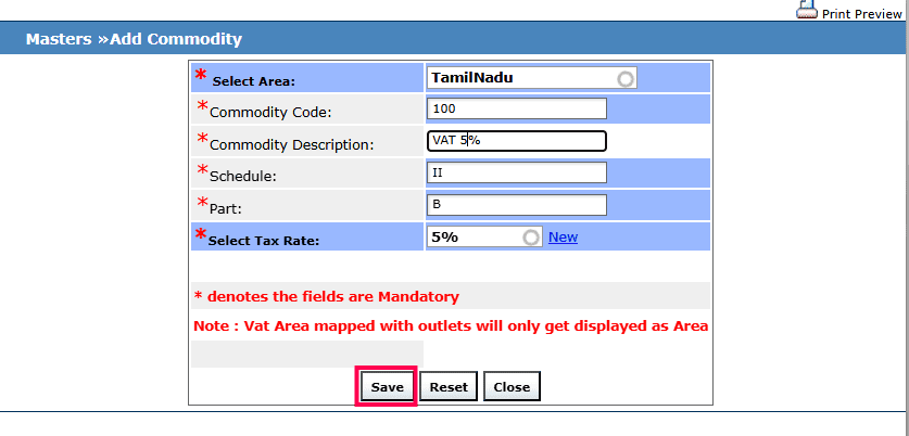 Click Save. A message stating that the VAT commodity master has been saved successfully will be displayed.