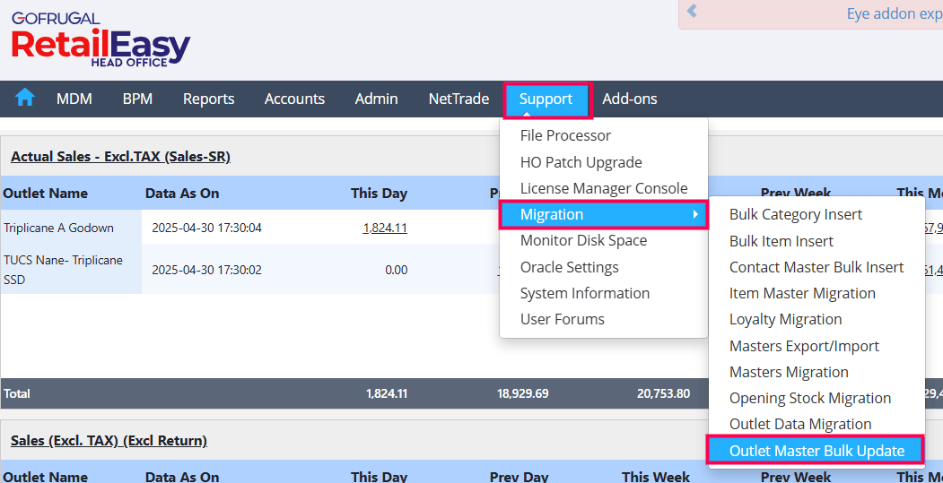 Open HQ and navigate to Support > Migration > Outlet Master Bulk Update.
