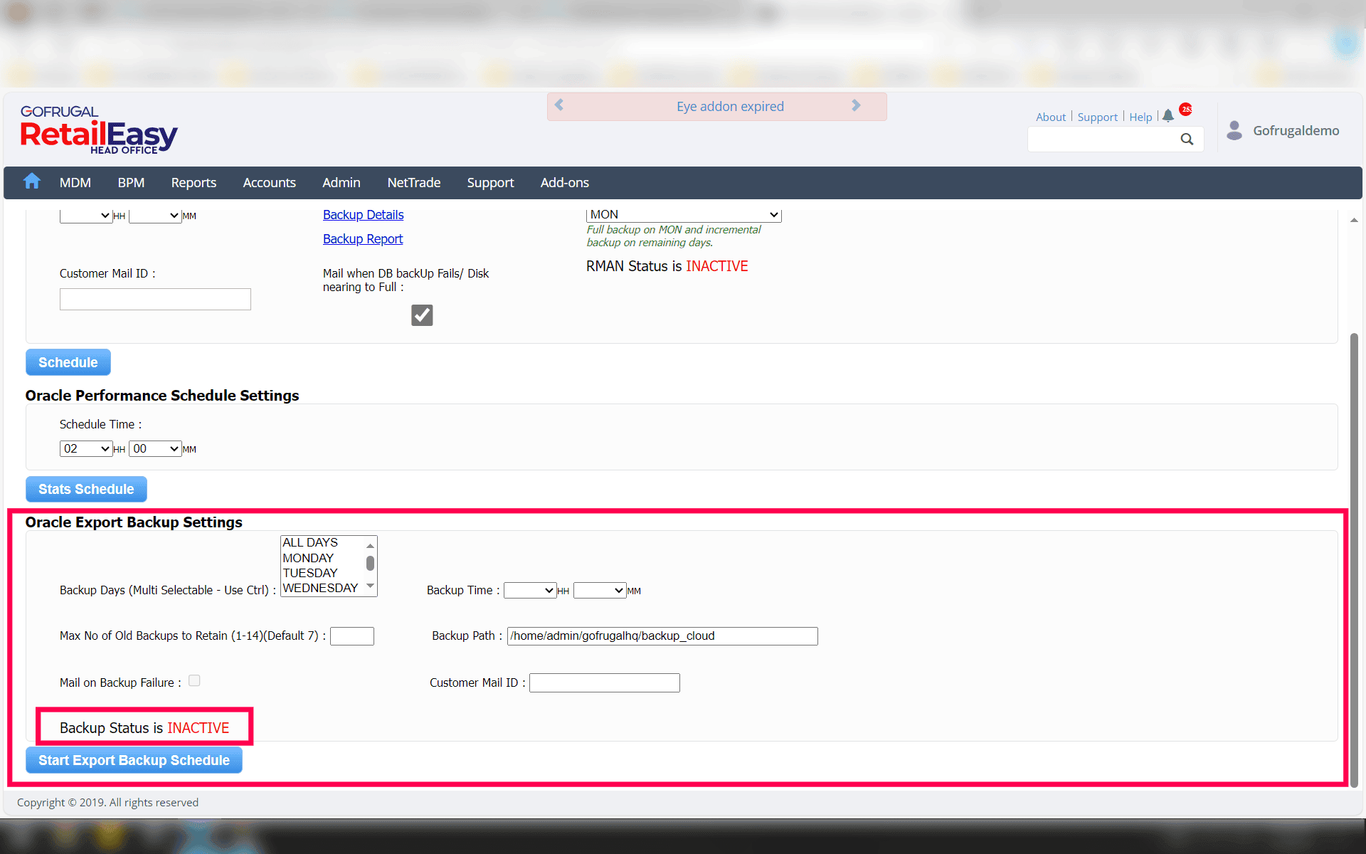 Note: RMAN Status should be ACTIVE. If it is not active, backups will not occur.