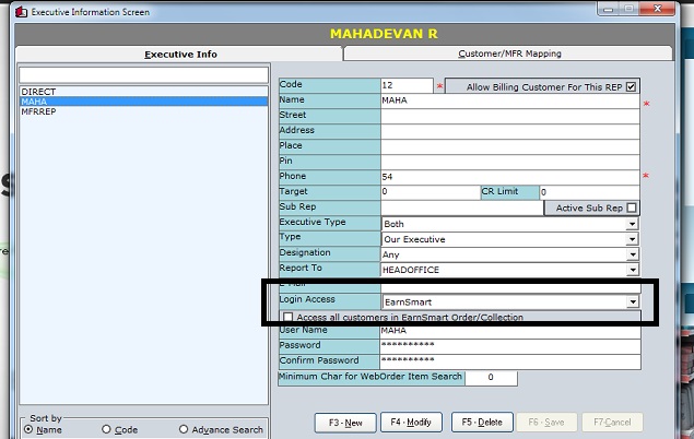 4. Go to Master-->Executive-->choose a rep-->go to login access-->choose Earnsmart(This can be done in both new creation of a rep or modify the already created rep)