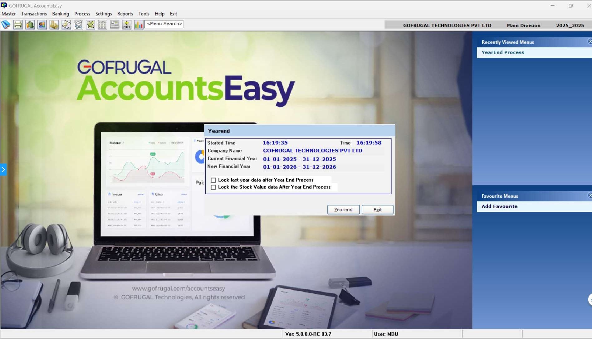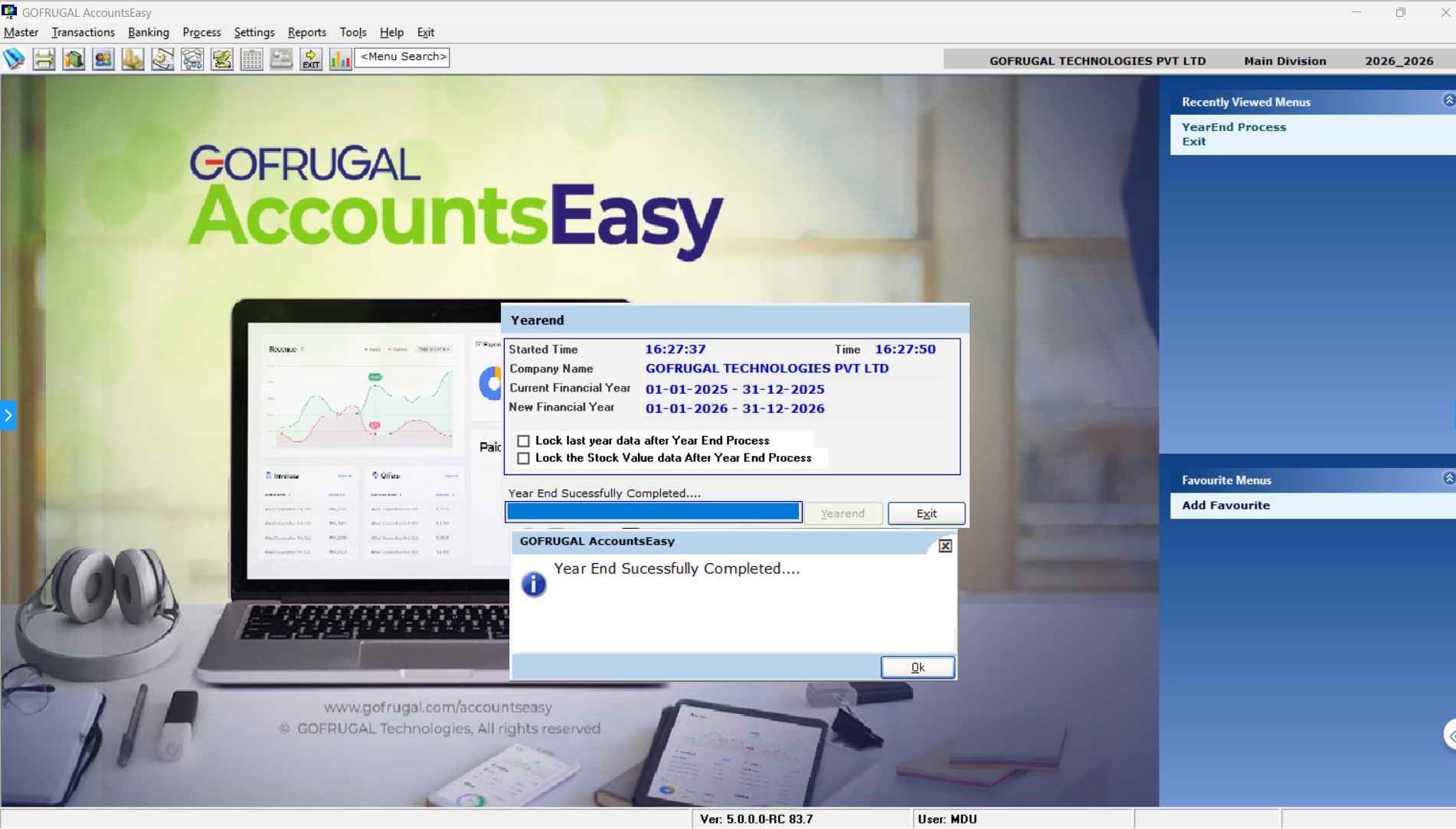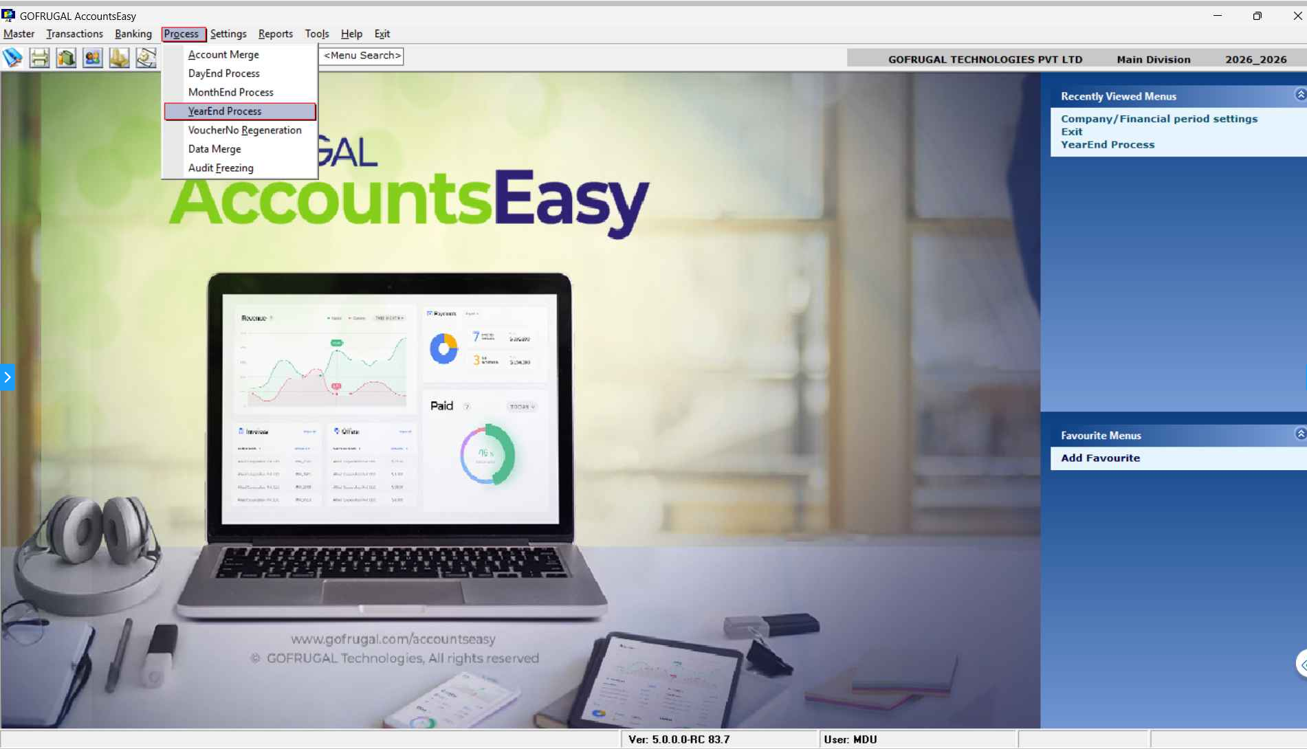 After ensuring the Financial Year 2025-2025, Click on Process->YearEnd Process.