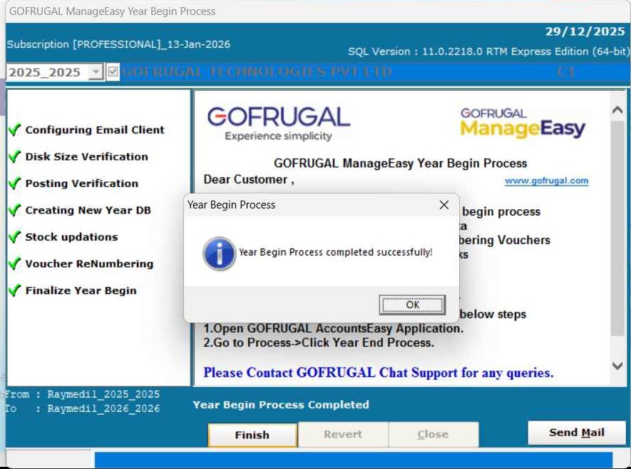 Upon year begin process completion, it will take you to another message box stating "Year begin process completed successfully" Click "OK"