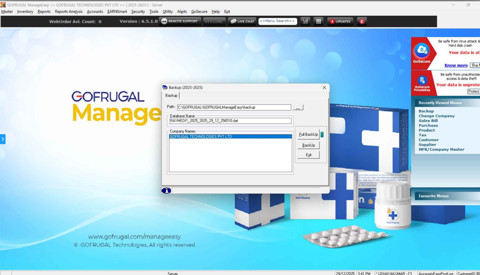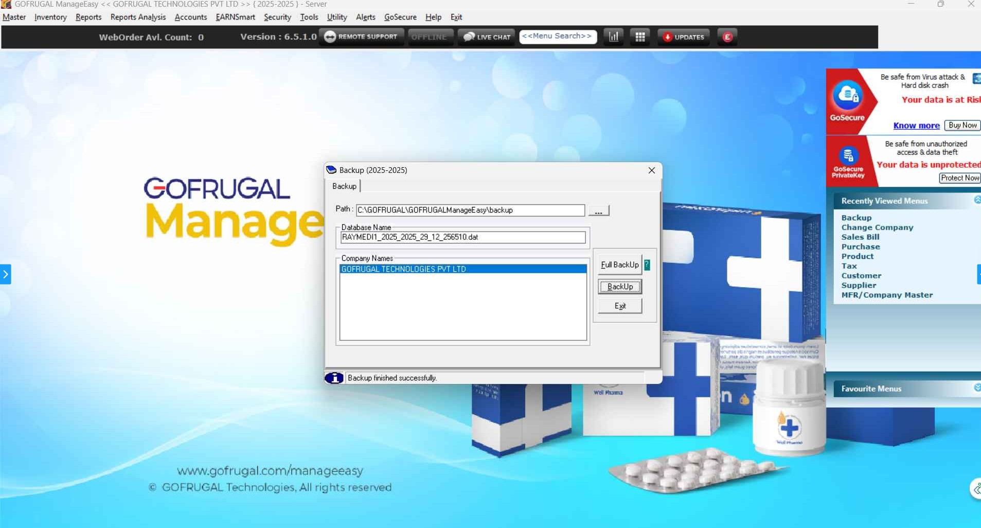 Make sure that there is sufficient space in the GOFRUGAL installed drive in the server.