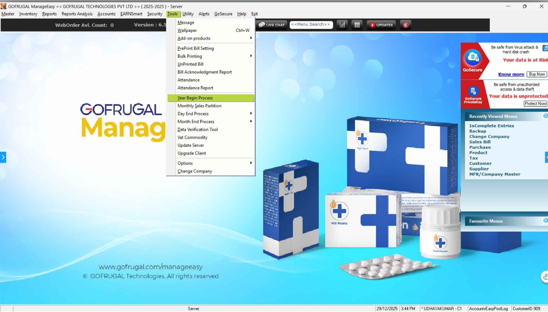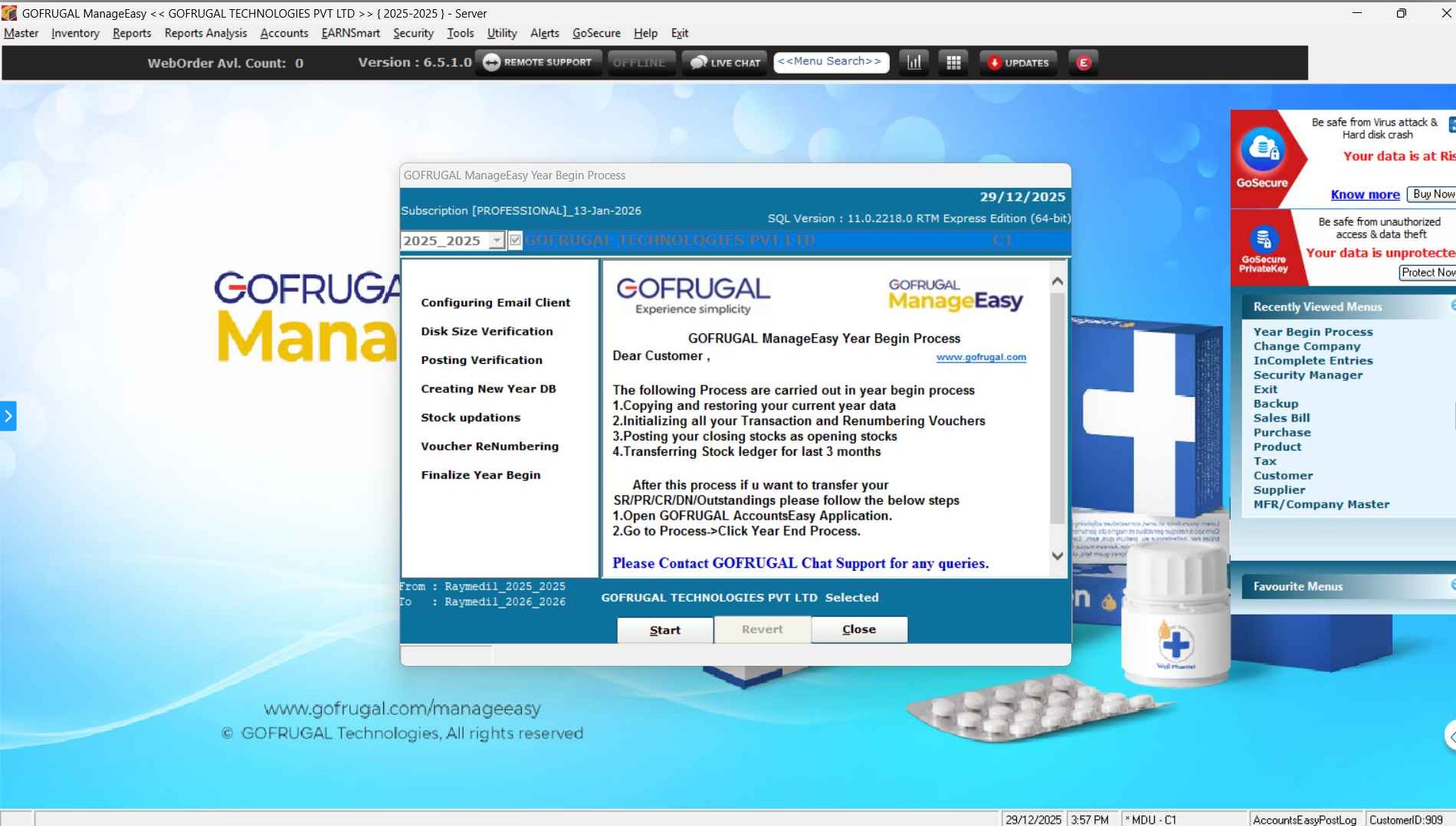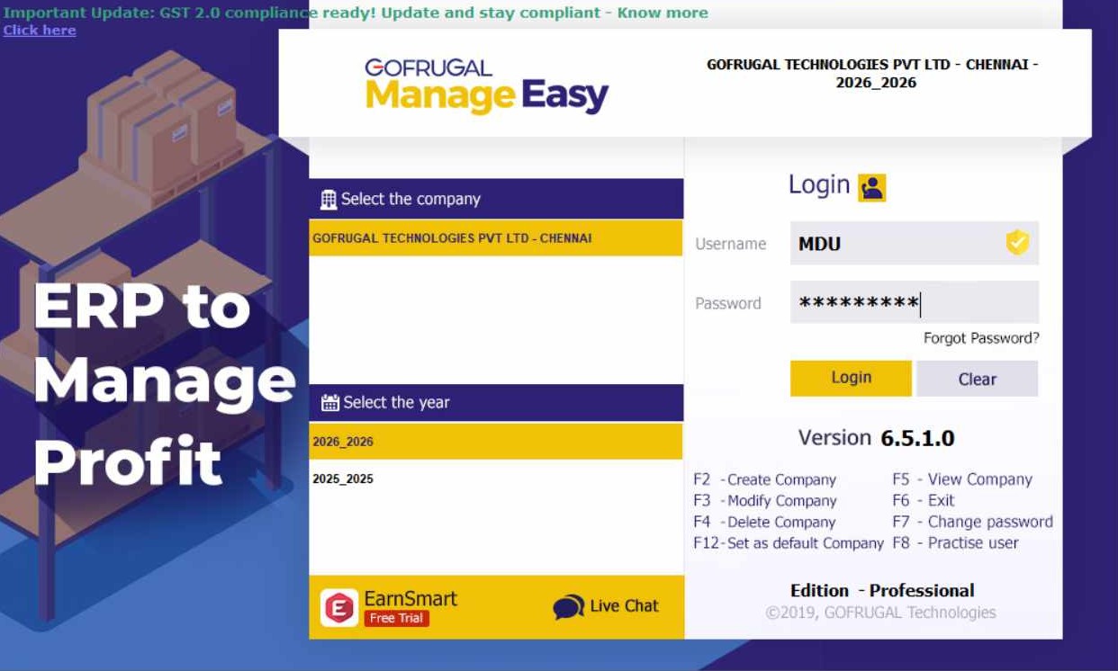Purpose : The Gofrugal ManageEasy Year Begin process helps businesses seamlessly close the previous financial year and start a new one by carrying forward the current stock and outstanding balances and resetting reports. It ensures accurate financial data management for the upcoming year.
