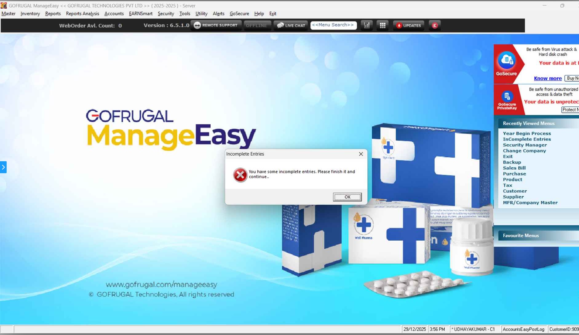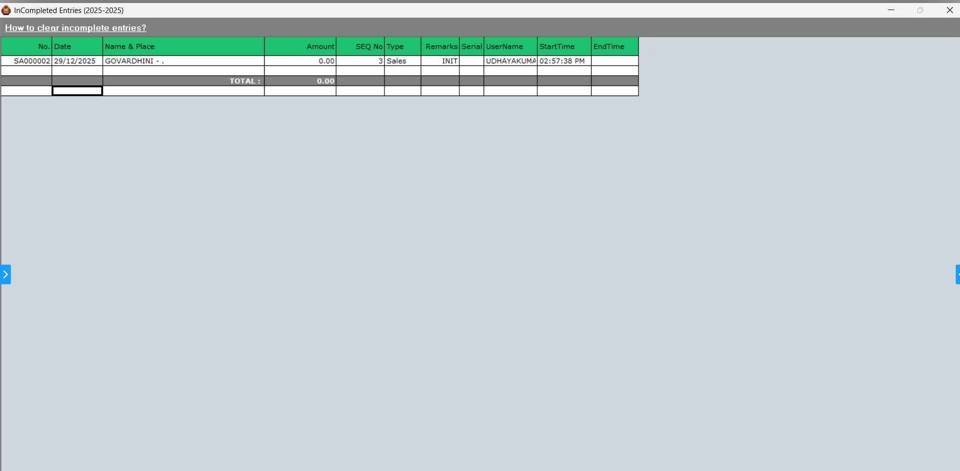 While proceeding, if you are receiving a pop-up message stating "You have incomplete entries, please finish it and continue", click ok and the incomplete entries screen will open with the entries.