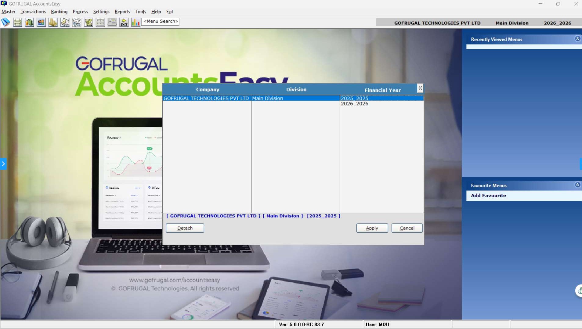In the AccountsEasy application, Goto Settings > Company/Financial period settings, make sure the Financial Year is 2025-2025, then click "APPLY"