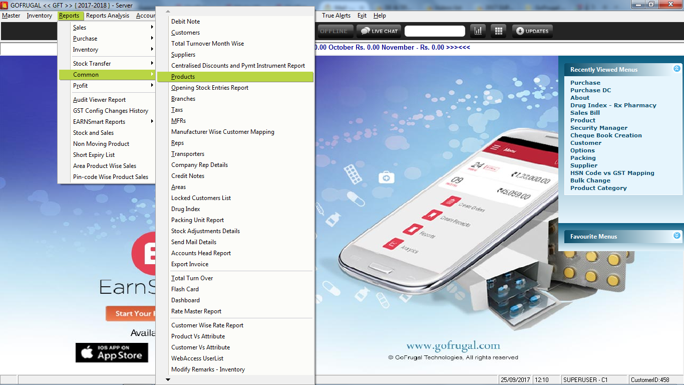 Steps Go to Master > Product On the left hand side you have a list of all the products in your database. You can sort them based on the filters such as Product Name Wise, Product Code Wise, etc. You can also apply a manufacture filter. On the right ...