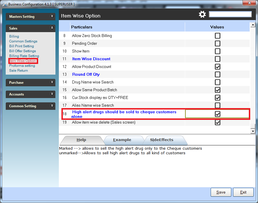 GO TO TOOLS->OPTIONS->OPTIONS->under item wise billing enable the option'high alert drug should be sold to cheque customer alone'