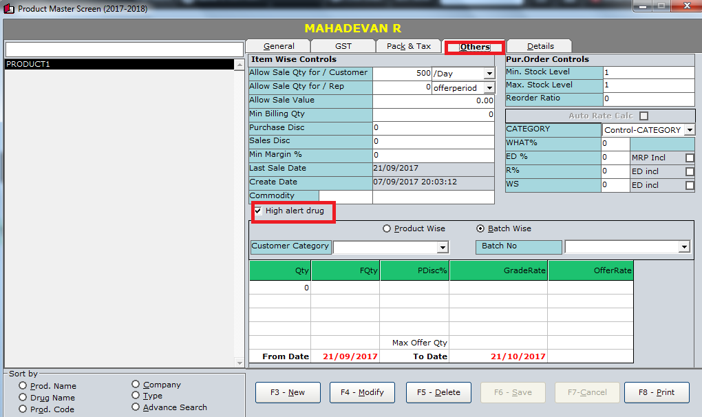 Steps Go to Master > Product On the left hand side you have a list of all the products in your database. You can sort them based on the filters such as Product Name Wise, Product Code Wise, etc. You can also apply a manufacture filter. On the right ...