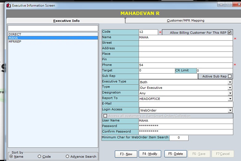 1. Go to Master-->Executive-->choose a rep-->go to login access-->choose web order(This can be done in both new creation of a rep or modify the already created rep)