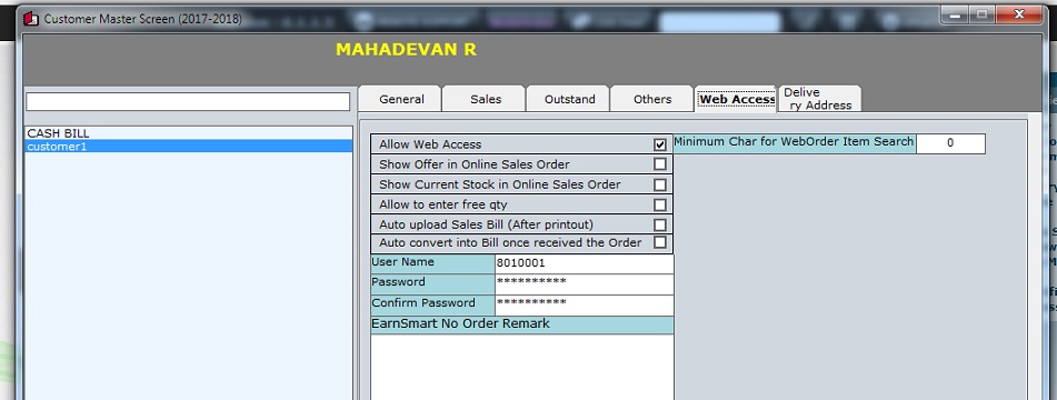 1.Go to Master-->Customer master-->choose a customer-->go to web access tab(This can be done in both new creation of a customer or modify the already created customer)